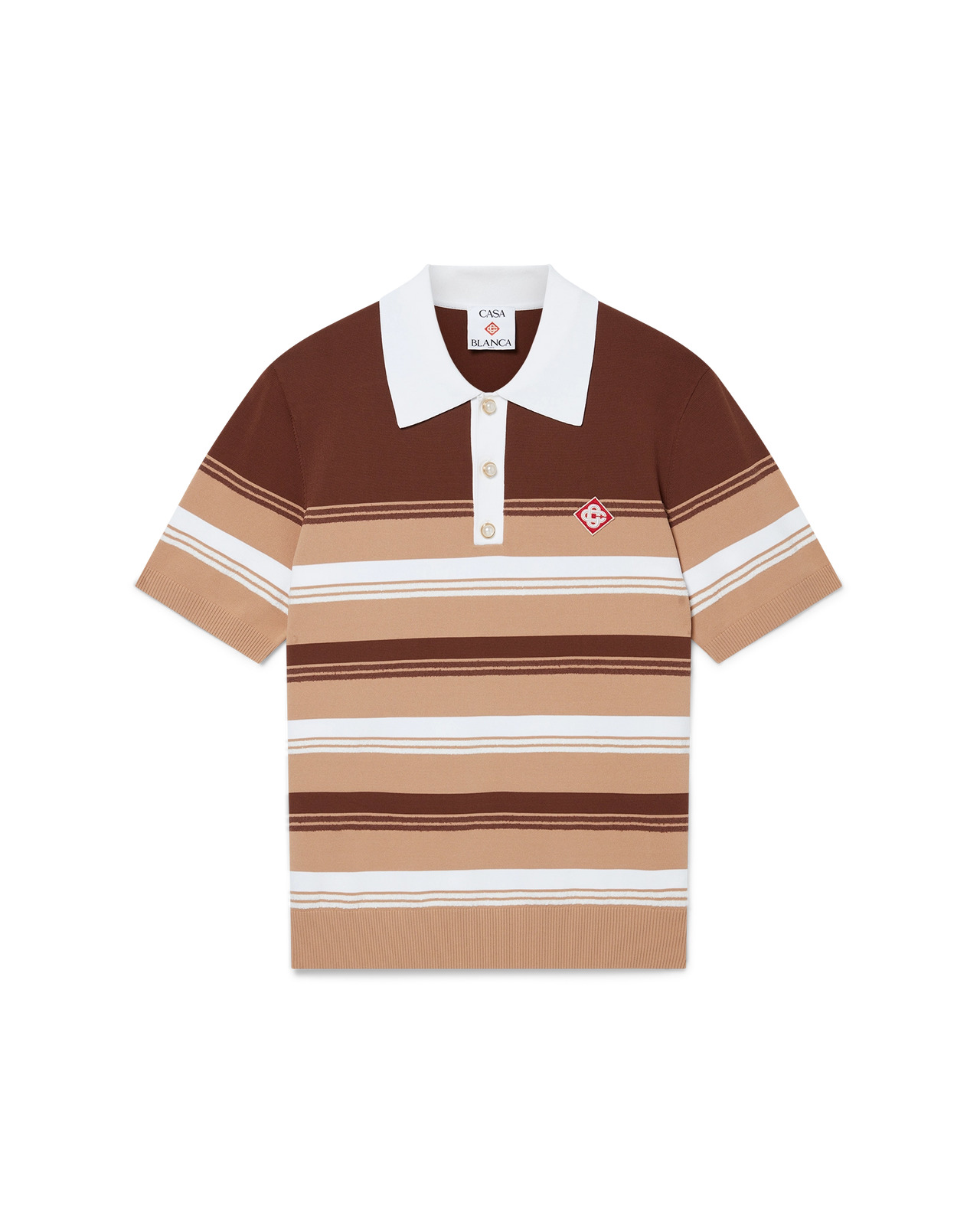 The Chicano stripe polo shirt is a short-sleeve design crafted from stripe knitted fabric featuring the house's signature diamond logo. Completed with signature gold rim pearl buttons, three-button placket, and rib cuffs, hem, collar and placket. - Striped knitted fabric - Main: 76% viscose 16% polyester 5% cotton 3% polyamide - Applique: 95% viscose 5% polyester - Colour: beige brown - Specialised dry clean only - The model is 187cm/6'1 and is wearing a size M
