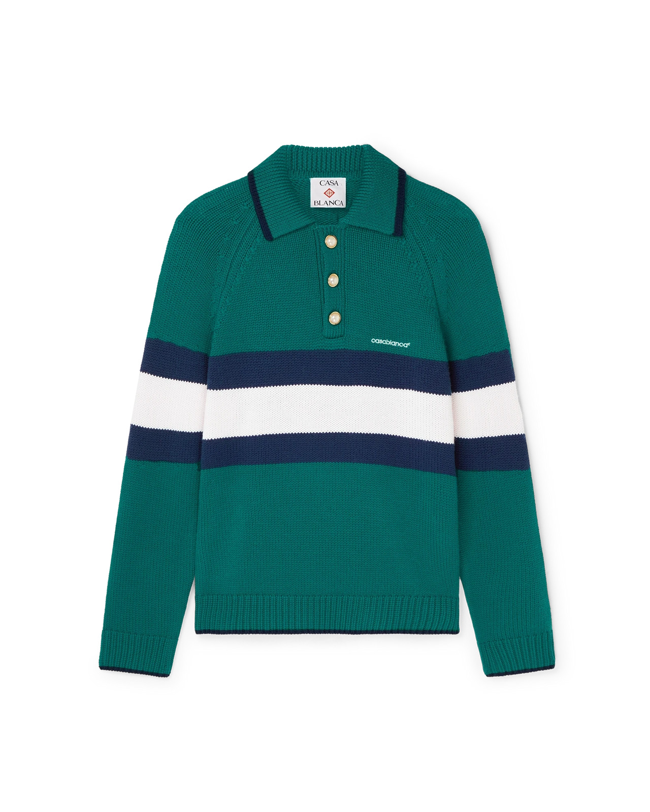 The colourblock polo shirt is a long-sleeve design crafted from merino wool fabric and features a blue and white stripe across the chest and back. Completed with raglan sleeves, ribbed cuffs, hem and collar, signature gold-rim pearl buttons and Casablanca logo. - Merino wool fabric - 100% merino wool - Embroidery: 100% polyester - Colour: green - Specialised dry clean only - Model is 185cm/6'1 and is wearing a size M