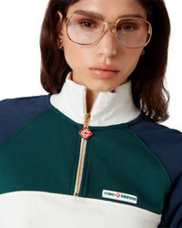 The colourblock quarter zip cropped sweatshirt is a long-sleeve sportswear design crafted from organic cotton fabric. Completed with the house's Casablanca logo, colourblock panels, rib collar, cuffs and hem with stripe details. - Cotton fabric - Main: 100% organic cotton - Contrast: 96% organic cotton 4% elastane - Colour: navy/white - Specialised dry clean only - Made in Portugal - Fits true to size, take your regular size - The model is 179cm/5'10.5 and is wearing a size S