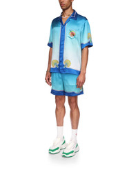 The Coquillage Coloré silk shirt is a short-sleeved all-over printed style featuring the gradient mosaic rainbow shell on a familiar blue ombre silk twill fabric. Completed with front button closure, open Cuban collar, breast pocket and contrast detail on the collar, cuffs, and hem. Printed silk twill fabric 100% silk Coquillage Coloré print Cuban collar Specialised dry clean only Made in Italy Fits true to size, take your regular size The model is 187cm/6’1 and is wearing a size M