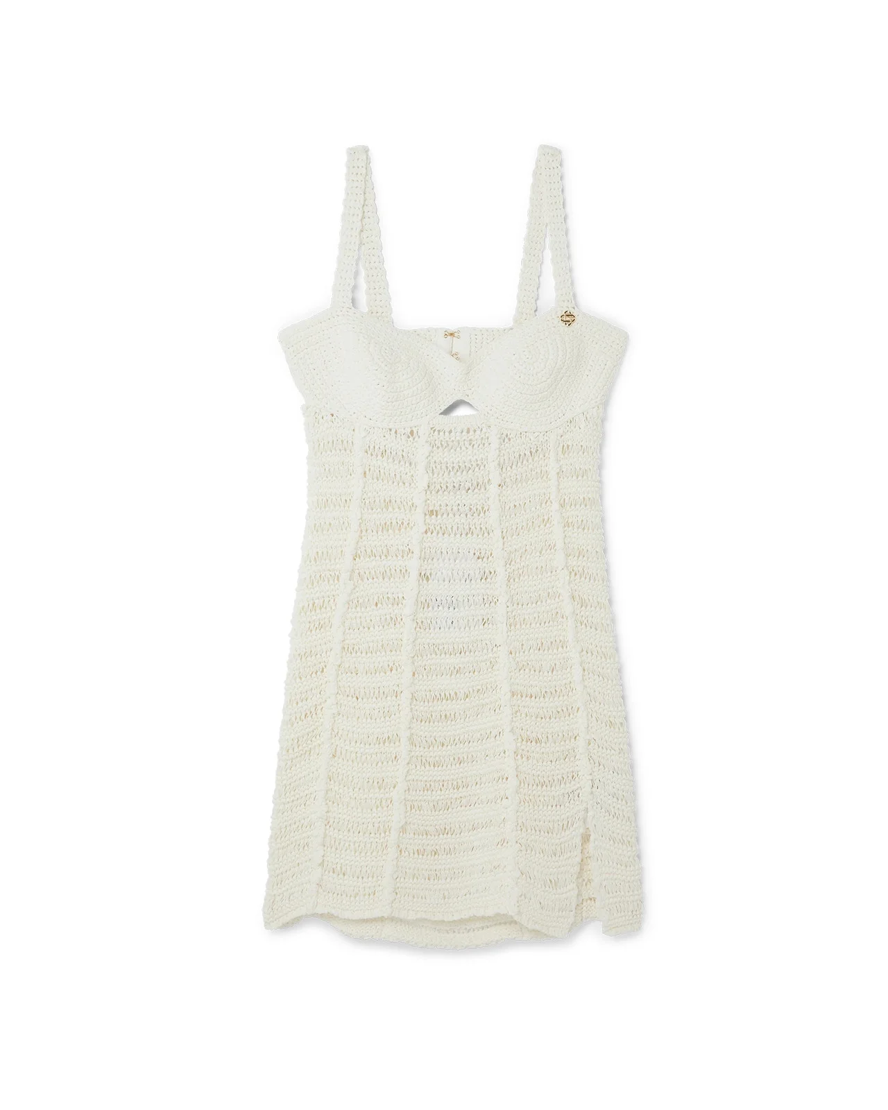 The crochet bustier dress is a mini-style crafted from an open-weave cotton blend fabric, with a fitted bralette and a deep open back. Completed with hook-and-eye closure, a gold-plated interlocking CC rivet, and shoulder straps. - Cotton crochet fabric - Main: 65% cotton 35% polyamide - Colour: white - Specialised dry clean only - Fits true to size, take your regular size - Model is 179cm/5'10.5 and is wearing a size S