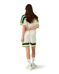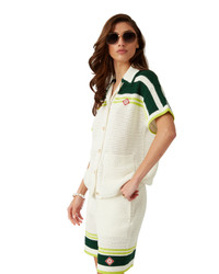 The crochet sporty shirt is a short-sleeve knitted design crafted from crochet cotton fabric and features the house's signature diamond logo. Completed with signature gold rim pearl buttons, stripe details on the shoulders and down the sleeves, front patch pockets, and striped edge detail on the collar, and cuffs. - Crochet cotton fabric - Main: 100% cotton - Trim: 95% viscose 5% polyester - Colour: green/white - Specialised dry clean only - The model is 179cm/5'10.5 and is wearing a size S - Exclusive to casablancaparis.com