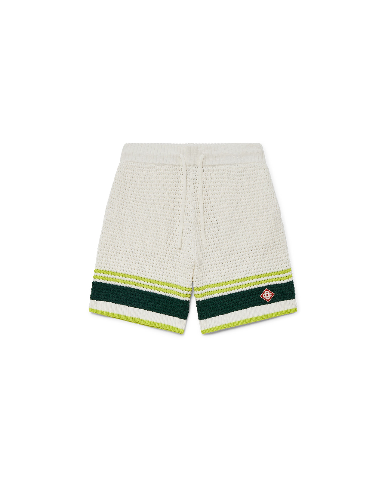 The crochet sporty shorts are a soft textured design crafted from knitted cotton fabric, featuring the house's signature diamond logo. Finished with a ribbed elasticated waistband with drawstring fastening, side pockets, and contrast stripe detail on the legs. - Crochet cotton fabric - Main: 100% cotton - Trim: 95% viscose 5% polyester - Colour: green/white - Specialised dry clean only - The model is 179cm/5'10.5 and is wearing a size S - Exclusive to casablancaparis.com