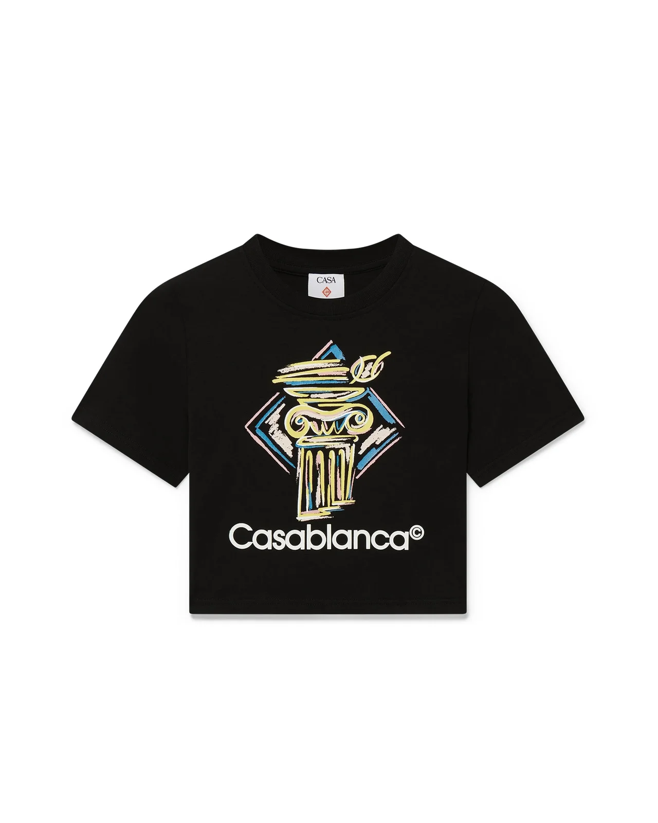 The Diamond Column baby t-shirt is a cropped short-sleeved printed design crafted from cotton blend fabric featuring the house's crayon iconography of a column. Completed with a classic crew neck - designed to fit above the navel. - Cotton loopback jersey fabric - Main: 95% organic cotton 5% elastane - Colour: black - Delicate machine wash - Wash and iron inside out; do not tumble dry - Made in Portugal - Model is 179cm/5'10.5 and is wearing a size S