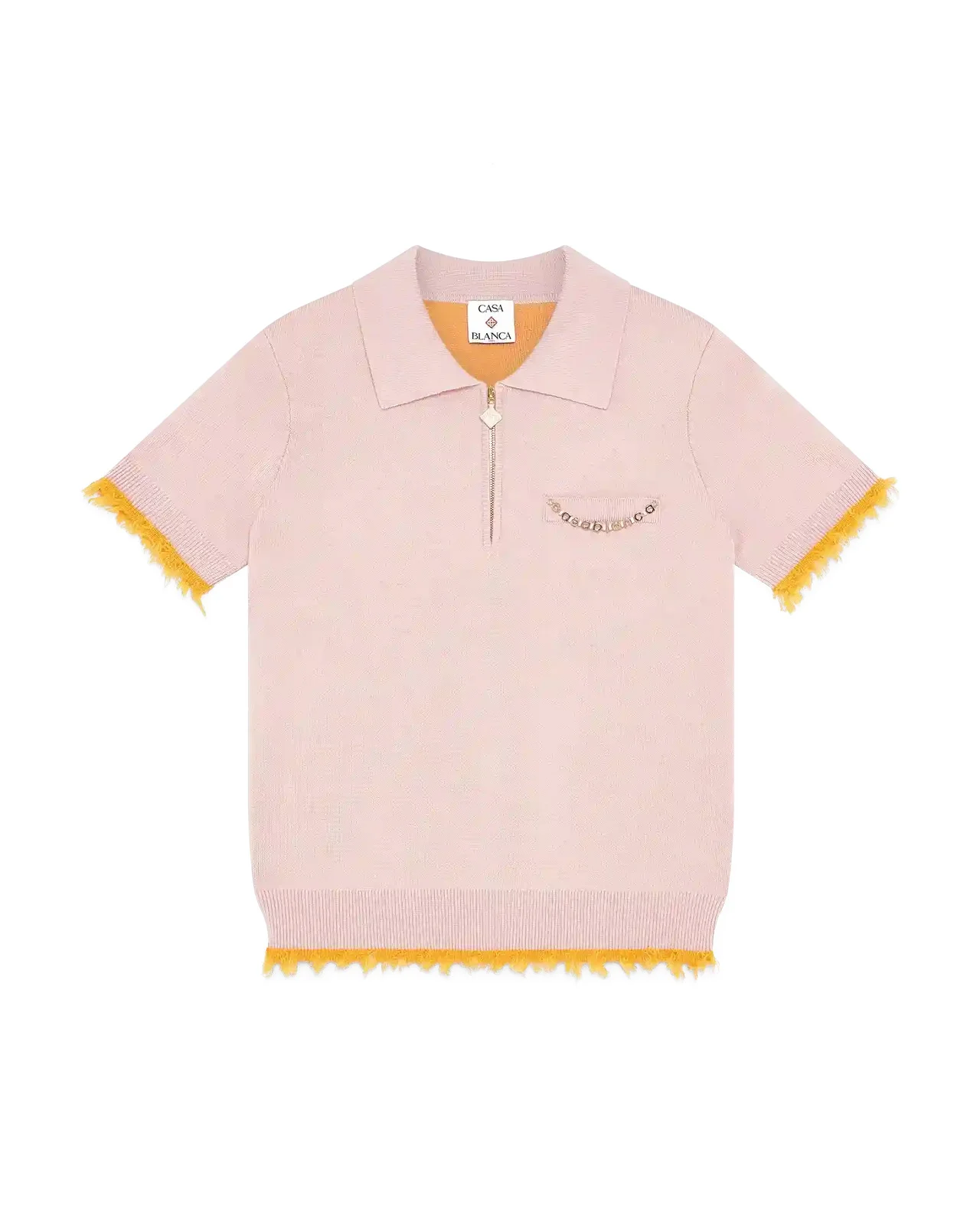 The polo shirt is a short-sleeve design crafted from merino wool fabric featuring a classic silhouette with pockets. Completed with a rib collar, a zip closure featuring the house's signature diamond logo zipper tab, a welt breast pocket, rib cuffs and hem with frayed edge detail, and a relaxed fit with refined construction. - Merino wool blend fabric - 96% wool 3% polyamide 1% elastane - Trim contrast - Colour: pink - Specialised dry clean only - Made in China - Relaxed fit