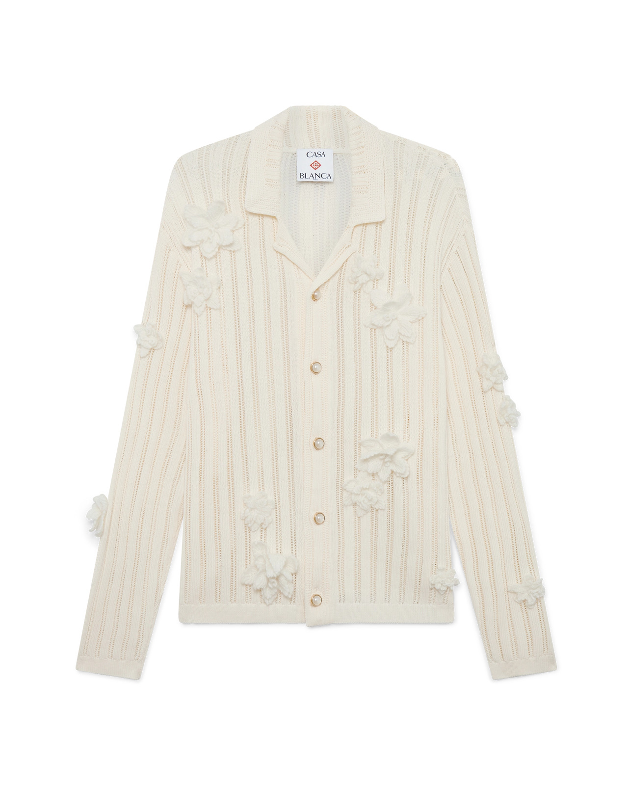 The Flower lace shirt has a long-sleeve design featuring applique flowers, crafted from knitted cotton fabric, with pointelle details resulting in a stripe-effect. Completed with button closure, signature gold rim pearl buttons, a collar, rib cuffs, and hem detail. - Knitted cotton fabric - 100% cotton - Applique: 44% polyamide 41% wool 15% mohair - Colour: white - Specialised dry clean only - Made in Portugal - The model is 187cm/6'1 and is wearing a size M