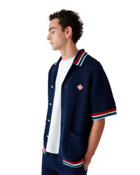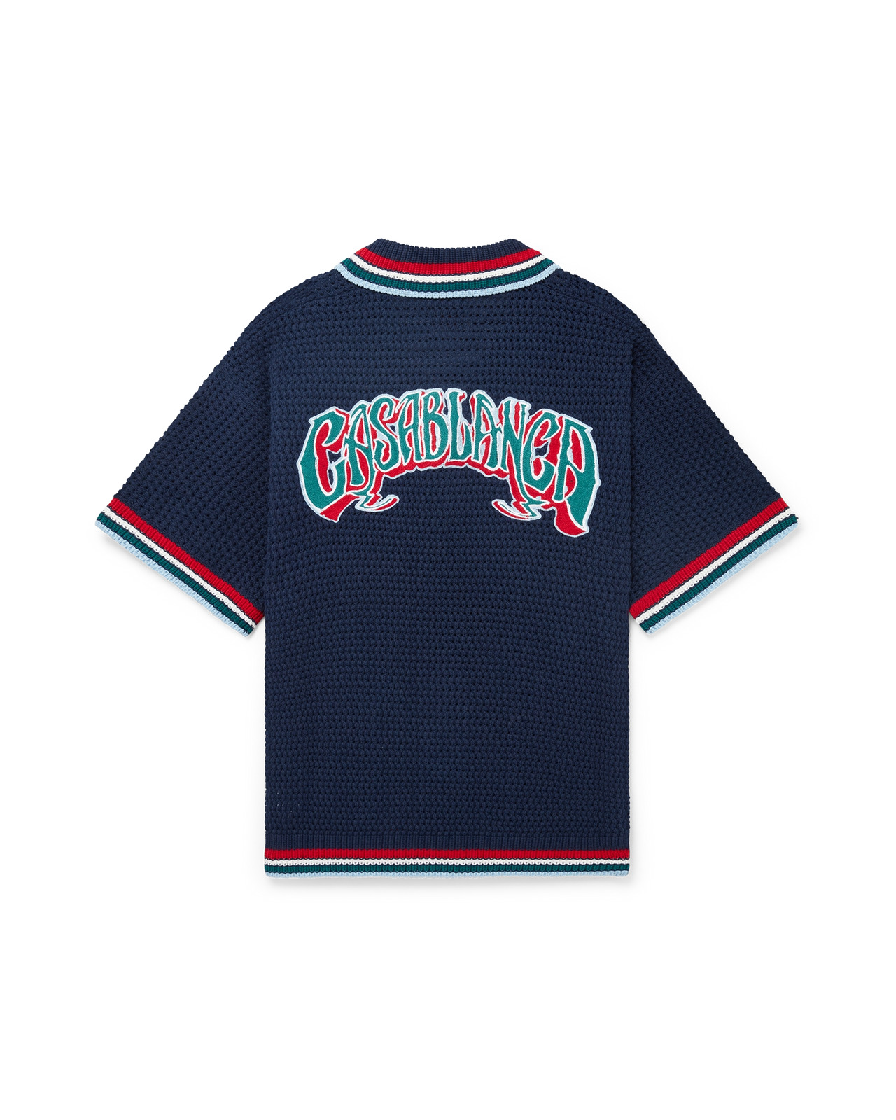 The Gothic crochet shirt is a short-sleeve knitted design crafted from crochet cotton fabric and features the house's signature diamond logo. Completed with signature gold rim pearl buttons, front patch pockets, and striped edge detail on the collar, cuffs and hem. - Crochet cotton fabric - Main: 100% cotton - Trim: 95% viscose 5% polyester - Colour: navy - Specialised dry clean only - The model is 186cm/6'1 and is wearing a size M - Exclusive to casablancaparis.com and selected retailers