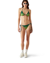 The Gradient bikini top is a printed triangular design crafted from technical swim fabric. Completed with contrast white string fastenings for the neck and back, removable cup support, and the house's signature gold-plated interlocking CC rivet on the left cup - this piece is designed to be worn with its coordinating bikini bottom. - Printed technical swim fabric - 78% recycled polyamide 22% elastane - Lining: 78% recycled polyamide 22% elastane - Colour: green gradient - Delicate machine wash - Made in Portugal - Fits true to size, take your regular size - Exclusive to casablancaparis.com