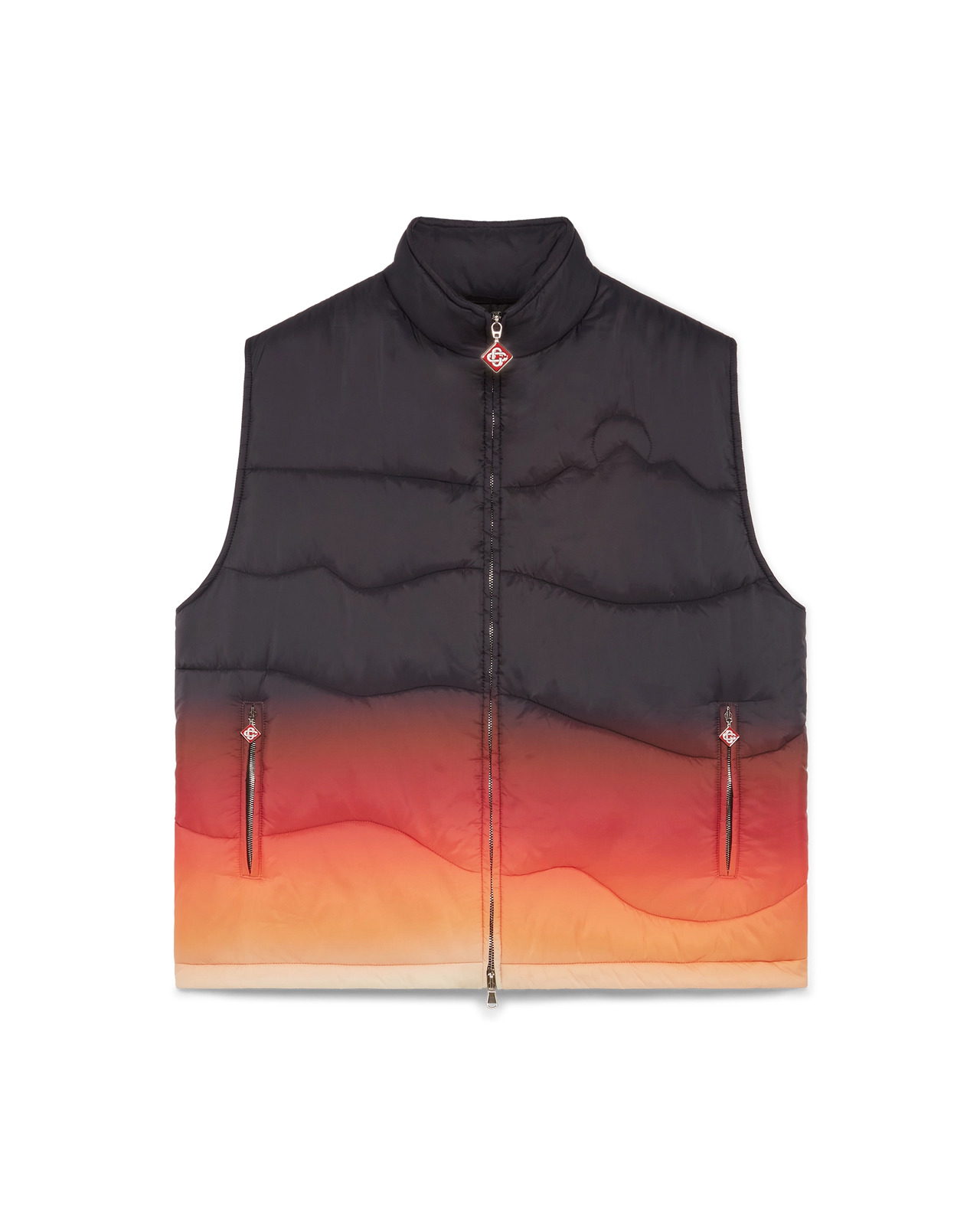 The gradient nylon puffer gilet is a refined outerwear design crafted from gradient printed nylon fabric, inspired by breathtaking colour transitions of dawn and dusk over Japan's snow-covered countryside. Evoking spectacular moments when vibrant skies illuminate rural mountain landscapes and villages glow against dramatic alpine backdrops. - Gradient printed down fabric - Main: 100% polyester - Lining: 96% polyester - Padding: 80% down 20% feather - Colour: Multicolour - Specialised dry clean only - Made in Italy - Relaxed fit - The model is 179cm/5'10 and is wearing a size S - Exclusive to casablancaparis.com, Paris Flagship store and selected retailers