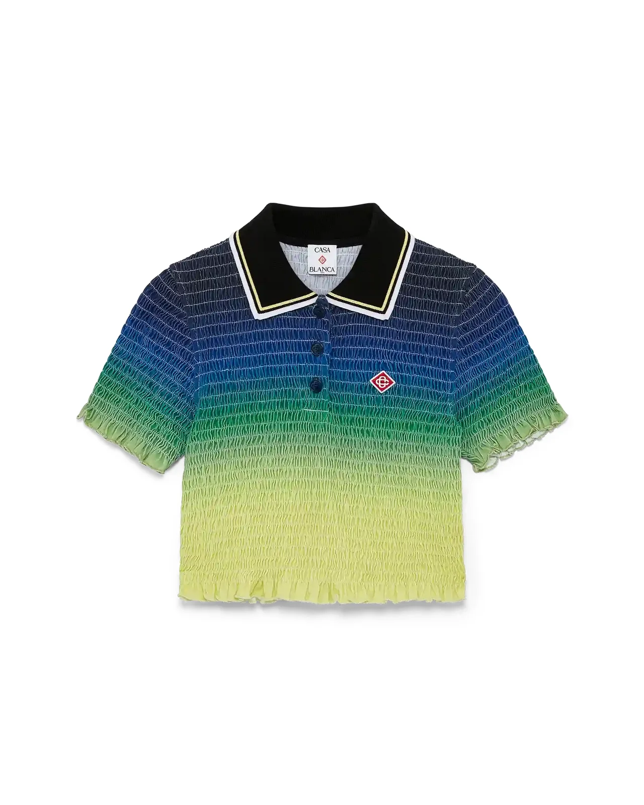 The gradient shirred polo top is a cropped style featuring the season's gradient colourway, and the house's signature diamond logo. Completed with a ribbed collar, short sleeves, three-button placket closure, and frill details on the cuffs and hem. Designed to fit above the navel. - Shirred cotton fabric - 100% organic cotton - Contrast: 100% cotton - Colour: gradient multicolour - Specialised dry clean only - Made in Portugal - Slim fit - The model is 177cm / 5'9 and is wearing size S - Exclusive to casablancaparis.com and our Paris and LA flagship stores