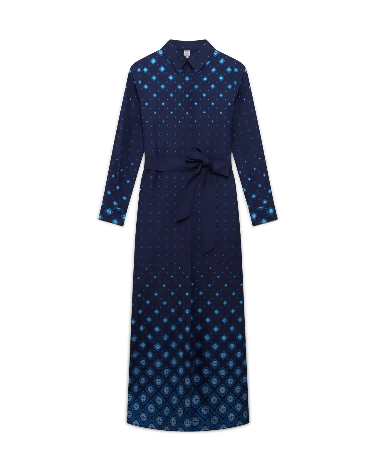 The Gradient silk shirt dress is a long-sleeve full-length classic design featuring the house's signature monogram gradient print, where tonal gradients cascade throughout the silhouette. Completed with a point collar construction, button-through closure, interlocking CC logo corozo buttons, belt loops, a tonal textile belt, and gold rim enamel buttons at the collar and cuffs. - Silk twill fabric - 100% silk - Colour: navy/light blue - Specialised dry clean only - Made in Italy - - The model is 172cm/ 5'8 and is wearing size S - Relaxed fit