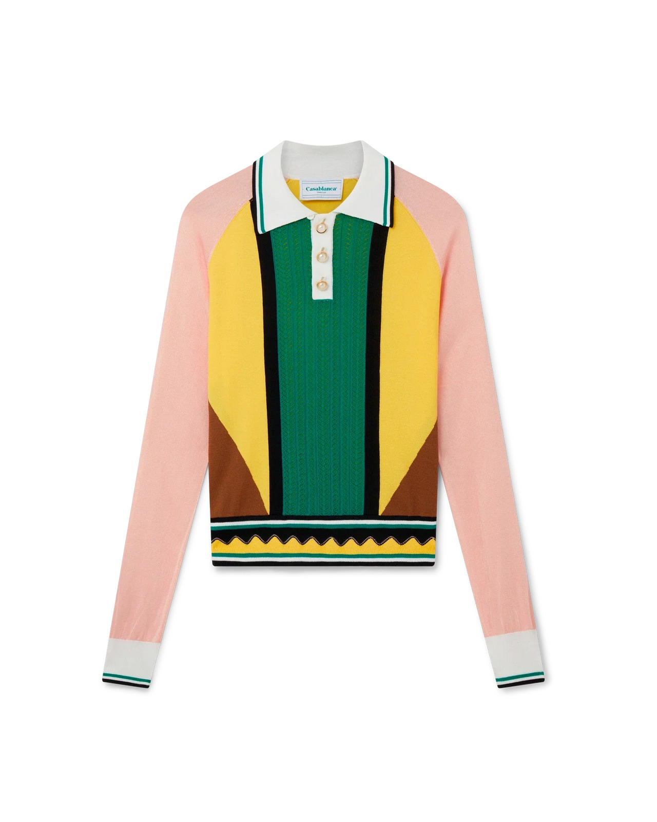 The Graphic Panelled polo shirt is a long-sleeve design inspired by Nigeria and features the colours of the country's flag. Completed with panel colour blocks, the house's signature gold rim pearl buttons, rib collar, cuffs, and hem with striped details. Knitted graphic fabric 70% viscose 30% nylon Colour: multicolour graphic Specialised dry clean only Fits true to size, take your regular size The model is 186cm/6’1 and is wearing a size S