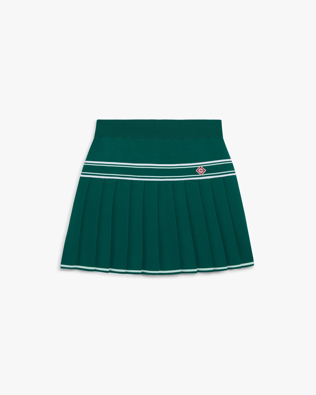 The green pleated knit mini skirt is a refined design featuring the house's signature diamond logo. Completed with a yoke featuring stripe detail, and a pleated panel with horizontal stripe hem detail for a feminine silhouette. - Knitted fabric - 100% viscose - Colour: green - Specialised dry clean only - Made in China - The model is 176cm/5'9.5 and is wearing a size s - Slim fit - Exclusive to casablancaparis.com