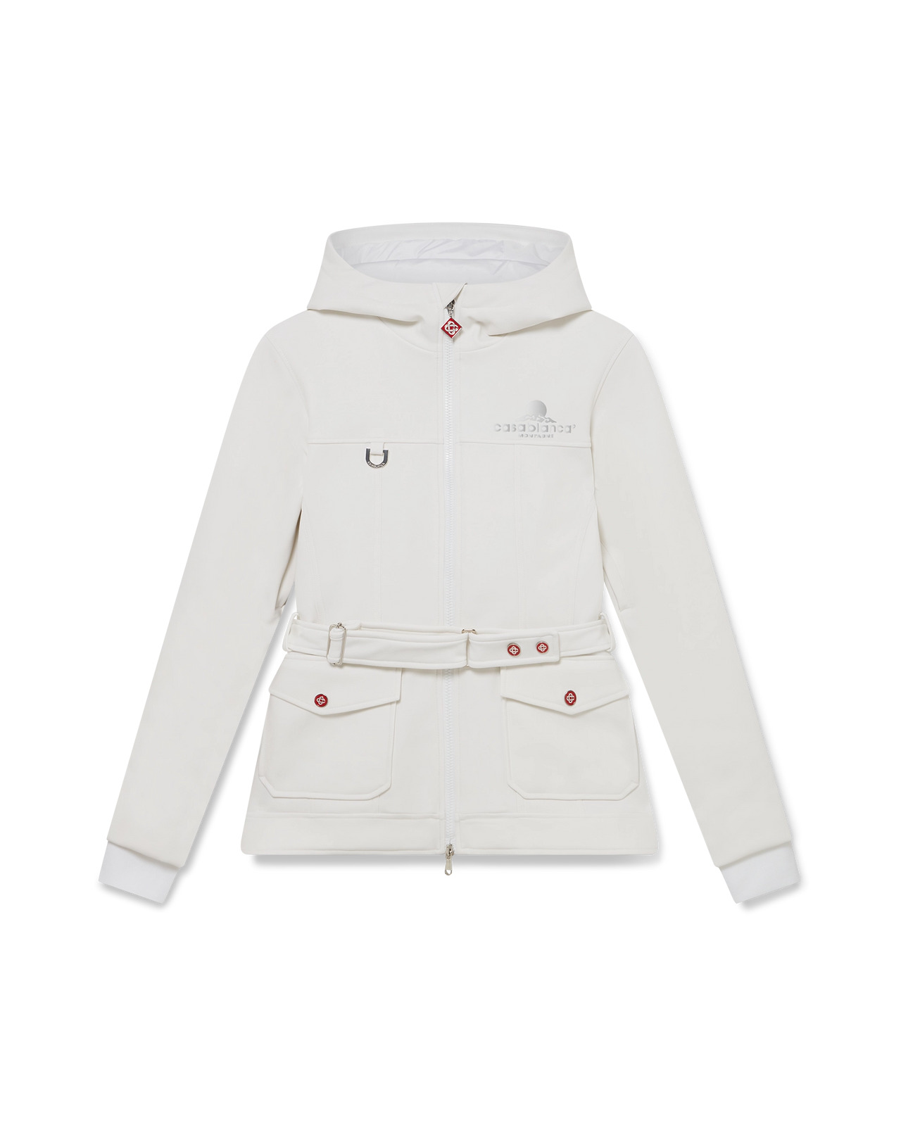 The ski jacket is a refined outerwear design crafted from fleece fabric in white, inspired by soft textures of Japan's winter countryside. With frozen landscapes and snow-laden bamboo groves create serene white corridors. This style features the house's seasonal Casa Montagne artwork on the back. Completed with a hood featuring CC logo toggles and drawstring fastenings, a stand-up collar providing extra warmth and protection against the elements, a zip closure with the house's signature diamond logo zipper tab, front pockets with silver-hardware closure, branded adjustable belt straps, and elasticised hem and cuffs. - Fleece fabric - Main: 67% polyamide, 33% elastane - Lining: 100% polyamide - Colour: white - Specialised dry clean only - Made in Portugal - Slim fit - The model is 179cm/5'10 and is wearing a size S - Exclusive to casablancaparis.com, Paris Flagship store and selected retailers
