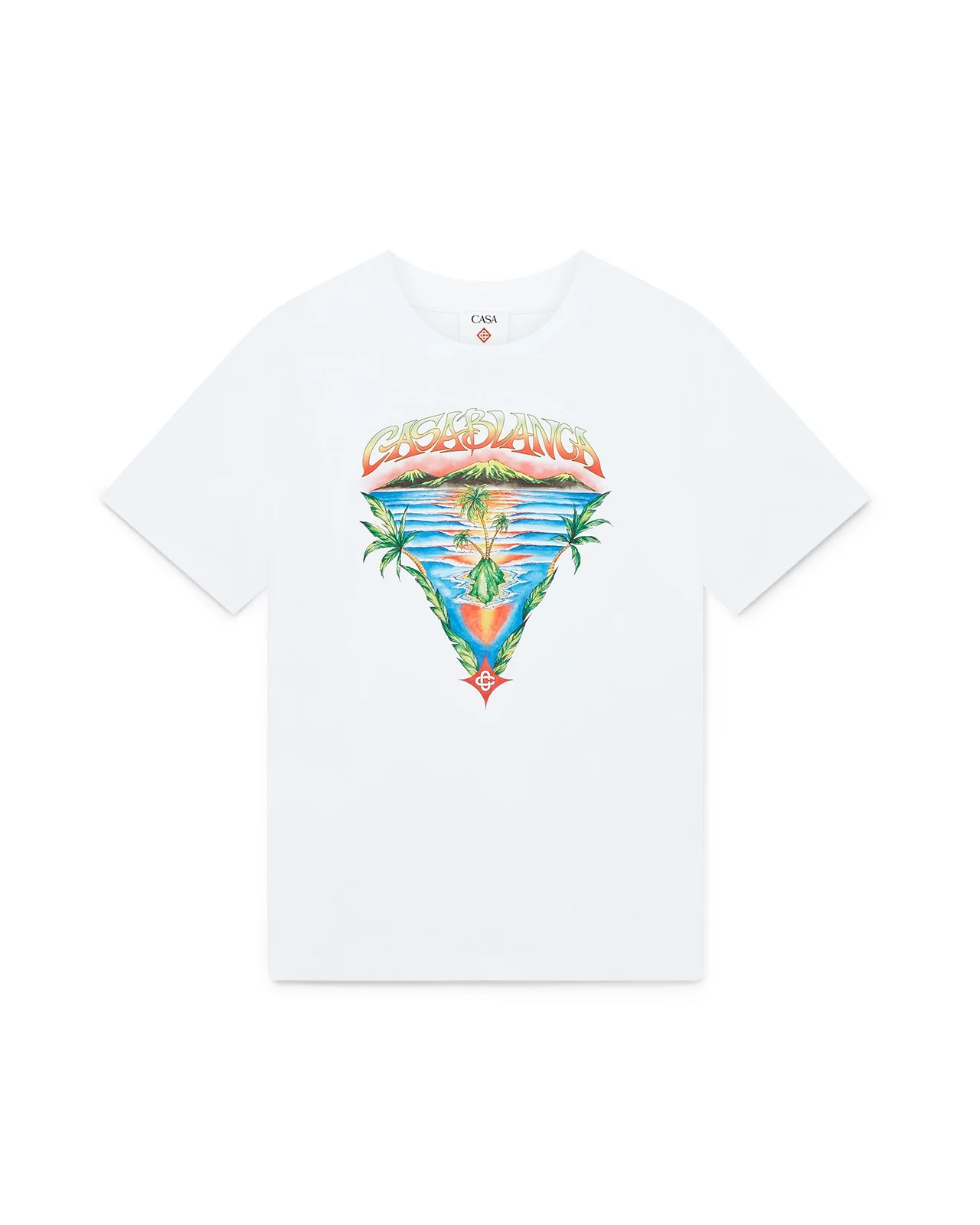 The Innocence Triangle classic t-shirt features an ocean scene at sunset with an island in the centre, rendered in a style influenced by classic surf t-shirt art. he artwork captures the golden hour's ethereal beauty over tropical waters, presenting an idealised vision of beach paradise through the house's refined sport-leisure lens. Completed with a crew neck, short sleeves, and a relaxed fit that embodies the house's refined approach to casualwear. - Printed cotton fabric - 100% organic cotton - Colour: white - Delicate machine wash - Made in Portugal - Relaxed fit - - The model is 189cm / 6'2 and is wearing size M - Exclusive to casablancaparis.com, and our Paris and LA flagship stores