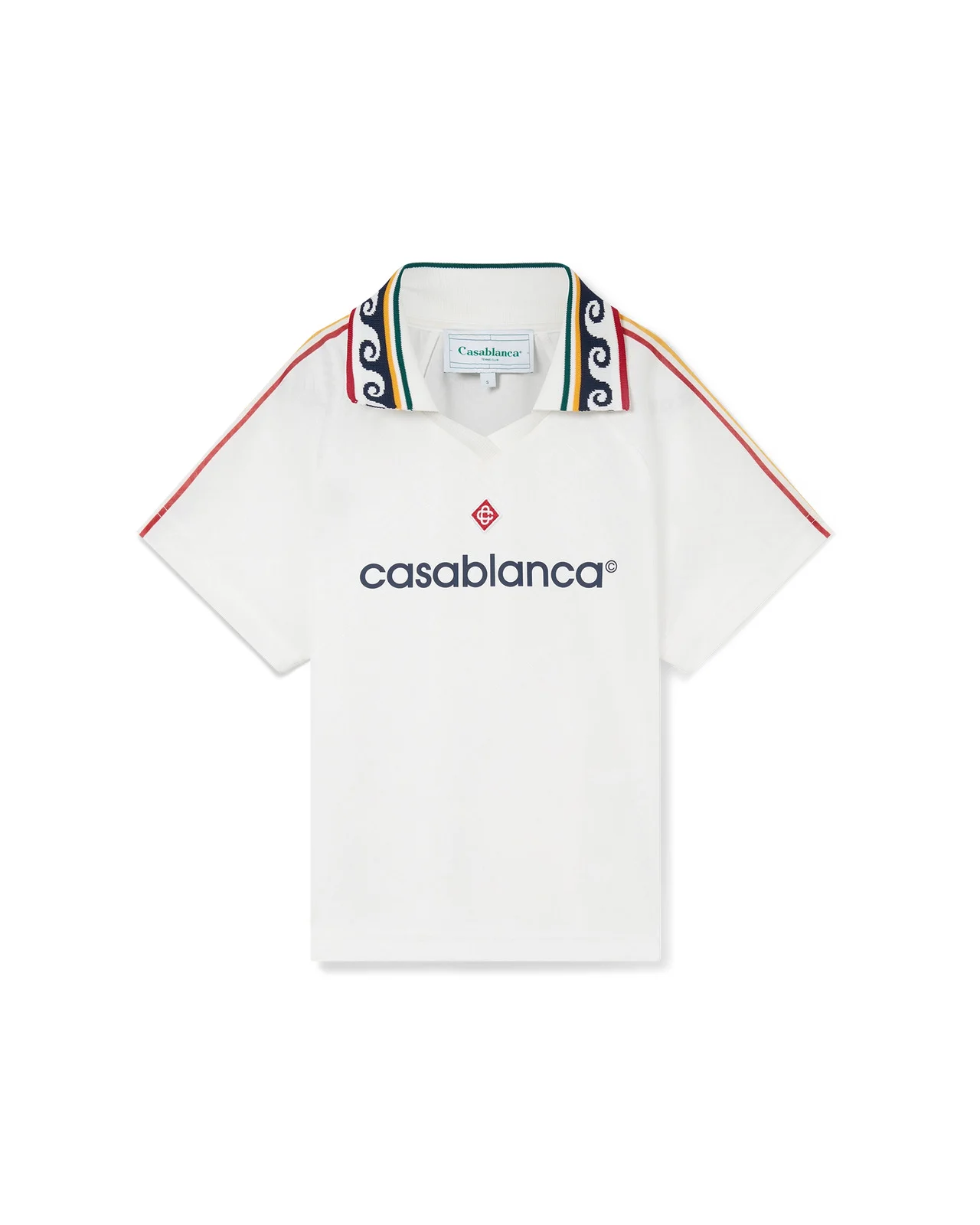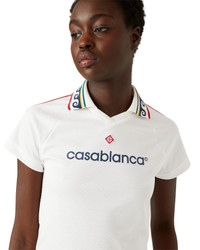 The Jacquard monogram football shirt is a fitted, cropped, capped-sleeve sportswear design featuring the house's signature diamond monogram. Crafted from a jacquard monogram fabric and completed with the house's signature diamond logo applique, a rib collar, stripe shoulder details, and a Casablanca logo across the chest. - Jacquard monogram fabric - Main: 100% polyester - Contrast: 95% polyester 5% elastane - Casablanca logo front print - Diamond logo patch - Colour: bright white - Specialised dry clean only - Made in Portugal - Fits true to size, take your regular size - The model is 179cm/5'10.5 and is wearing a size S