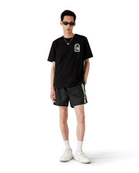The jacquard stripe swim shorts are an all-over printed style crafted from a breathable polyester fabric. Completed with an elasticated waistband, an internal drawstring fastening, in-seam side pockets, an internal pocket, and a lining. - Jacquard fabric - Main: 100% polyester - Lining: 80% polyamide 20% elastane - Colour: black - Delicate machine wash - Made in Portugal - Relaxed fit - The model is 187cm/6'1 and is wearing a size M