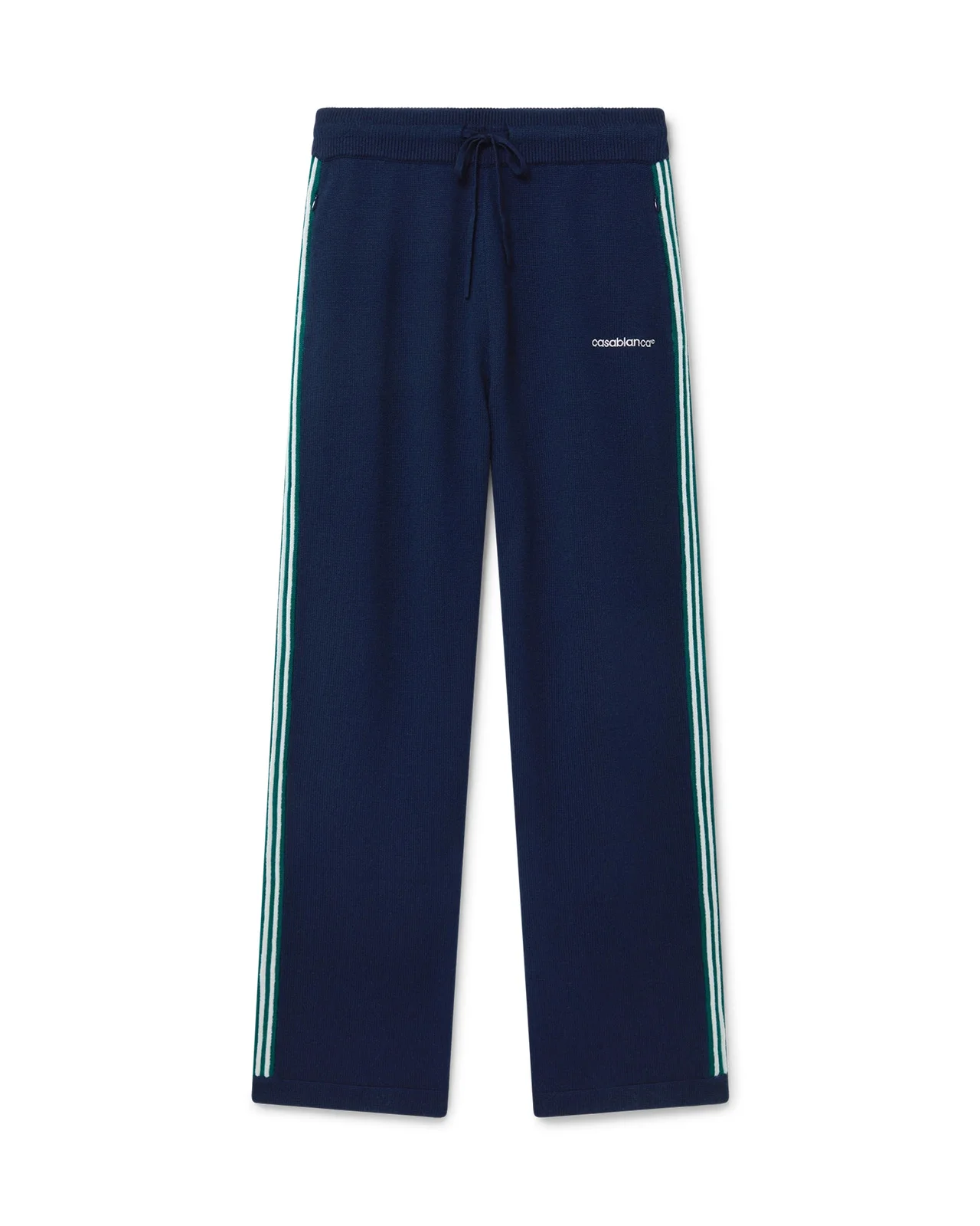 The knit tennis trousers have a sportswear-inspired design crafted from merino wool fabric. Completed with contrast ribbed edge detail on the cuffs, hem, collar and placket, front zip closure, a funnel collar and Casablanca logo. - Merino wool fabric - 100% merino wool - Embroidery: 100% polyester - Colour: navy - Specialised dry clean only - The model is 187cm/6'1 and is wearing a size M