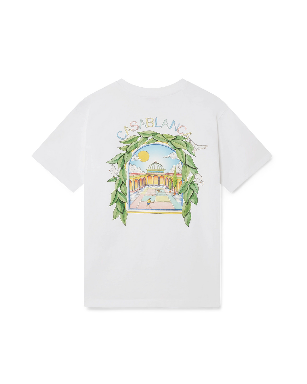 The L'Arch De Tennis t-shirt is a short-sleeve design featuring a seasonal screen-printed artwork where the free flow of nature meets the structure of man-made design - the Arch, an abstract symbol of strength. Completed with a classic crew neck. - Printed cotton fabric - 100% organic cotton - Colour: white - Delicate machine wash - Made in Portugal - Relaxed fit - The model is 187cm/6'1 and is wearing a size M - Exclusive to casablancaparis.com