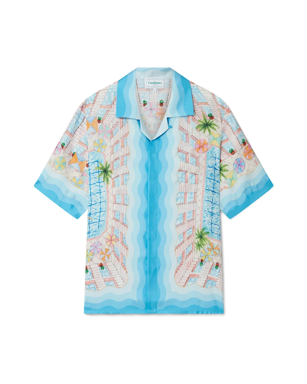 The Le Plongeon silk shirt is a short-sleeve printed style crafted from a silk twill fabric featuring seasonal artwork inspired by a beautiful day at the hotel's swimming pool and travel idealism viewed from above - giving a new perspective. The colour palette is light and idealistic, comprising soft pastel colours. Completed with a front button closure, Cuban collar, a breast pocket and contrast Memphis wave-inspired gradient stripe details on the cuffs, collar, hem and placket. - Printed silk twill fabric - 100% silk - Le Plongeon print multicolour - Specialised dry clean only - Made in Italy - Unisex fit, take your regular size - The model is 187cm/6’1 and is wearing a size M