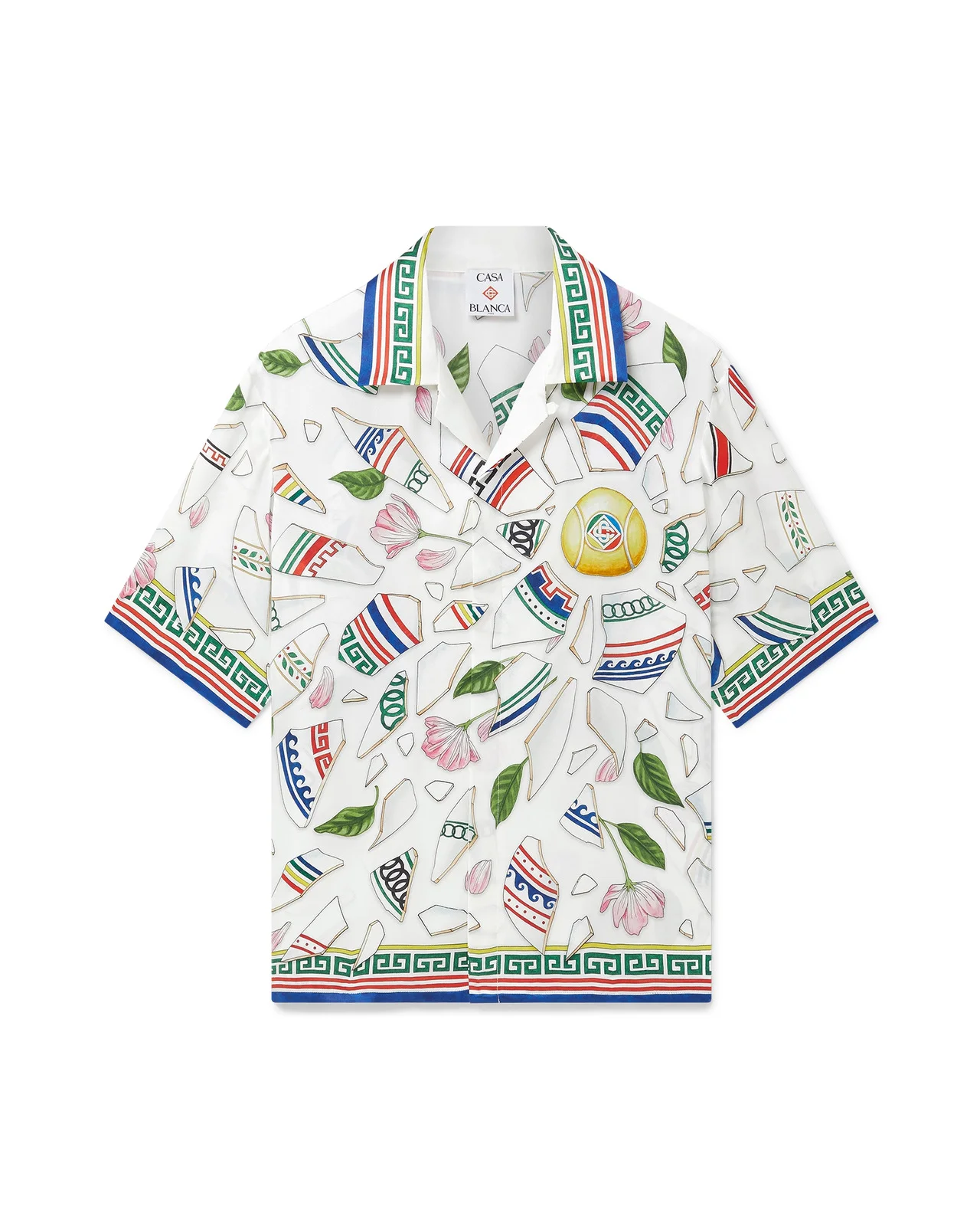 The Le Vase Brise silk shirt is a short-sleeved all-over printed design crafted from a silk satin fabric featuring the house's seasonal print, inspired by the continued study of the classical beauty and contemporary allure of Ancient Greece. Completed with signature interlocking CC logo corozo buttons, button closure, a Cuban collar, and Greek key-inspired detail on the cuffs, collar and hem. - Printed silk satin fabric - 100% silk - Le Vase Brise multicolour print - Specialised dry clean only - Made in Italy - Fits true to size, take your regular size - The model is 179cm/5'10.5 and is wearing a size M
