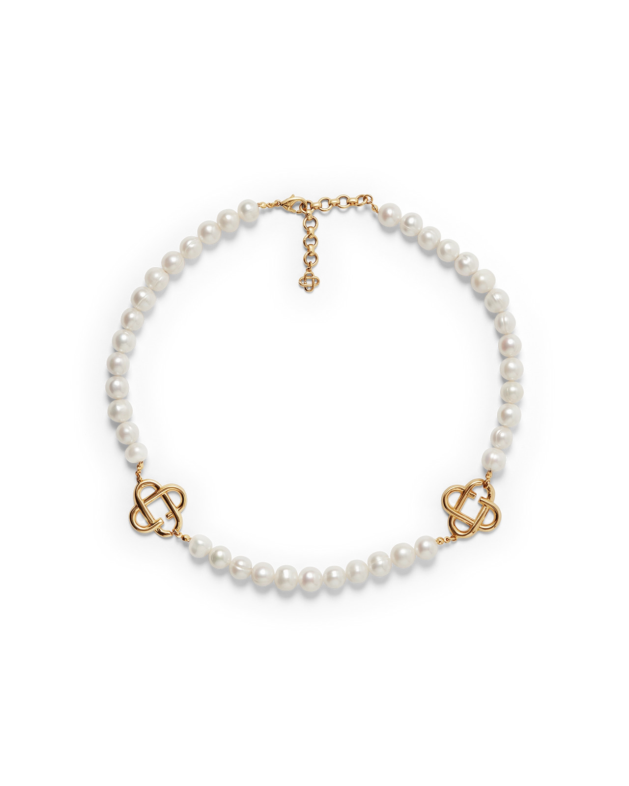 The Medium Pearl logo necklace places the Casablanca insignia across the neck, with the style intended for a snug fit. The necklace features freshwater pearls and a gold-plated lobster clasp and chain. - 18k gold-plated brass - Freshwater pearls - Lobster clasp - Clean with a soft, dry cloth