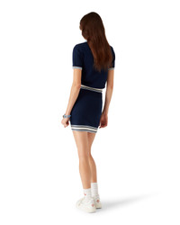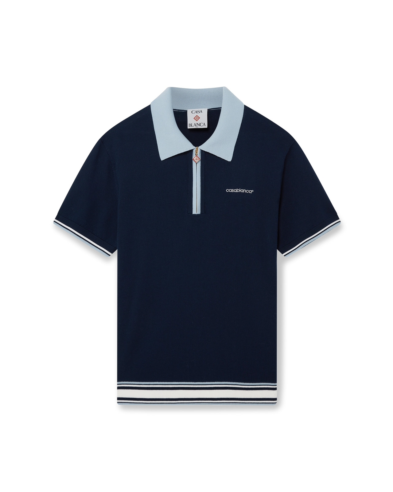 The merino knit tennis polo shirt is a short-sleeve design crafted from merino wool fabric. Completed with a zip closure, signature diamond logo zipper tab, stripe hem and cuffs details, a contrast rib collar and placket, and the house's Casablanca logo. - Merino wool fabric - Main: 100% merino wool - Embroidery: 100% polyester - Colour: blue - Specialised dry clean only - Made in China - The model is 177cm/5'9.5 and is wearing a size S