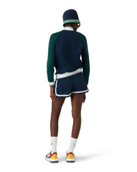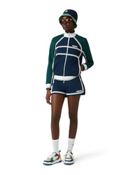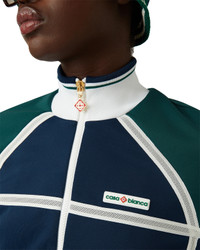 The mesh tape track jacket is a sportswear-inspired design crafted from a tricot fabric. Completed with a zip closure, panels with white piping details, a rib collar, cuffs and hem with stripe details, side pockets, mesh tape detail, and the house's signature Casablanca logo. - Tricot fabric - Main: 31% cotton 22% viscose 21% polyamide 14% polyester 11% recycled polyester 1% elastane - Lining: 100% polyester - Colour: navy/green - Specialised dry clean only - Made in Hungary - Fits true to size, take your regular size - The model is 176cm/5'9.5 and is wearing a size S