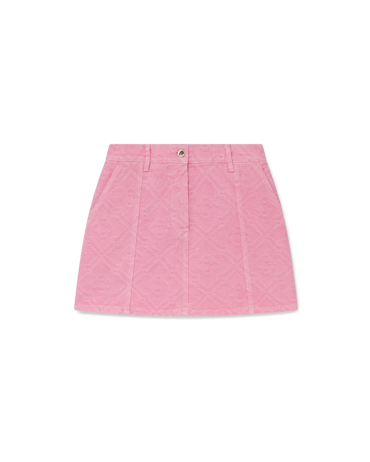 The monogram denim skirt is a mini A-line design featuring the house's signature monogram pattern. Completed with a branded gold-plated button and zip closure, belt loops, slanted front pockets, details and applique accents that reflect the brand's sophisticated interpretation of modern denim codes. - Monogram denim fabric - 100% cotton - Lining: 65% polyester 35% cotton - Colour: pink - Specialised dry clean only - Made in Italy - - The model is 172cm/ 5'8 and is wearing size S - Slim fit