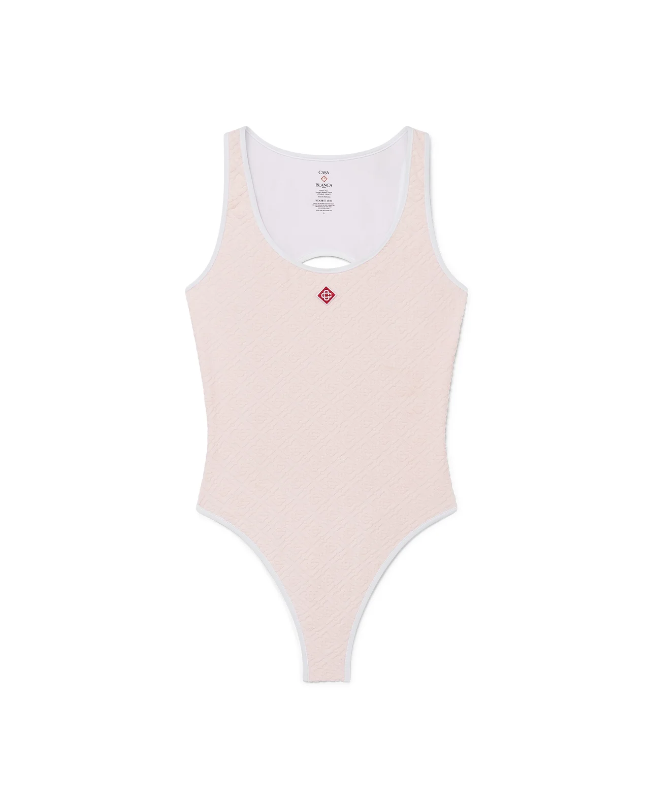 The monogram swimsuit is a one-piece design featuring the house's monogram print and signature diamond logo. Completed with contrast edge trim, high-cut legs, a cut-out back and a scoop neck. - Technical swim fabric - 78% polyester 22% elastane - Monogram print pink - Delicate machine wash - Made in Portugal - - The model is 175cm/ 5'9.5 and is wearing size S - Exclusive to casablancaparis.com