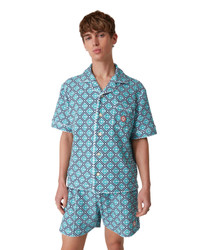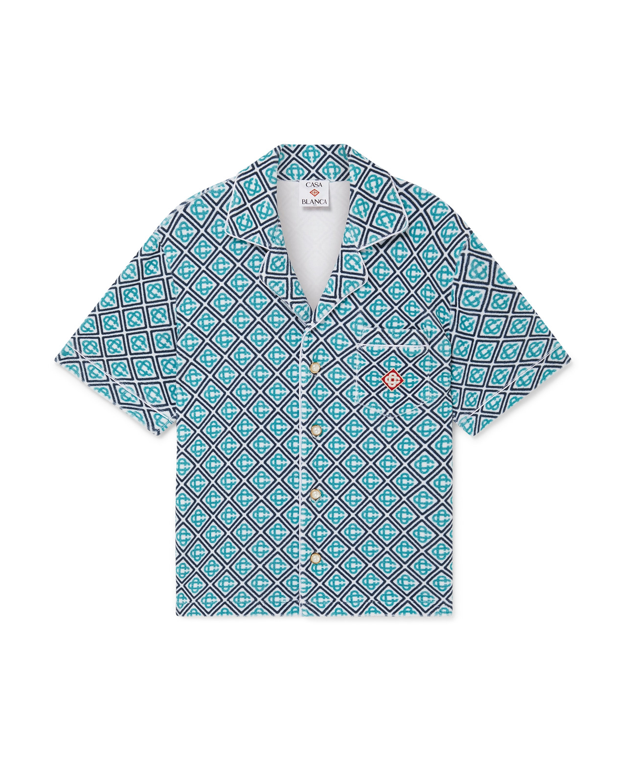 The Monogram towelling shirt is a short-sleeve design crafted from a monogram towelling fabric featuring a gradient monogram offering a twist on a signature Casablanca print. Completed with a button closure, signature gold rim pearl buttons, a breast pocket, and edge piping detail on the collar, placket, cuffs and pocket. - Monogram towelling fabric - 86% cotton 13% polyamide 1% elastane - Monogram print blue - Delicate machine wash - Made in Portugal - The model is 185cm/6'1 and is wearing a size M - Exclusive to casablancaparis.com and selected retailers