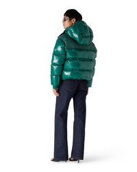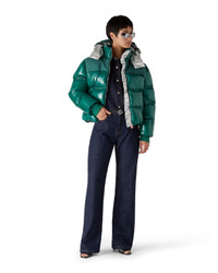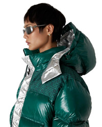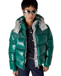 The nylon puffer jacket is a modern boxy outerwear design crafted from ripstop nylon fabric with down filling and contrasting monogram jacquard panel across the shoulders. Completed with a hood featuring CC logo toggles and drawstring fastenings, a stand-up collar providing extra warmth and protection against the elements, a zip closure with the house's signature diamond logo zipper tab, front pockets with zip closure, branded adjustable cuff straps, and elasticised hem and cuffs. - Ripstop nylon fabric - 100% polyamide - Colour: green - Specialised dry clean only - Made in Italy - Relaxed fit - The model is 177cm/5'9.5 and is wearing a size S