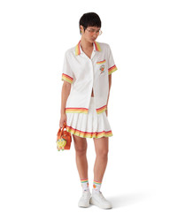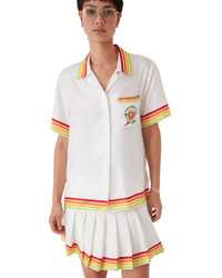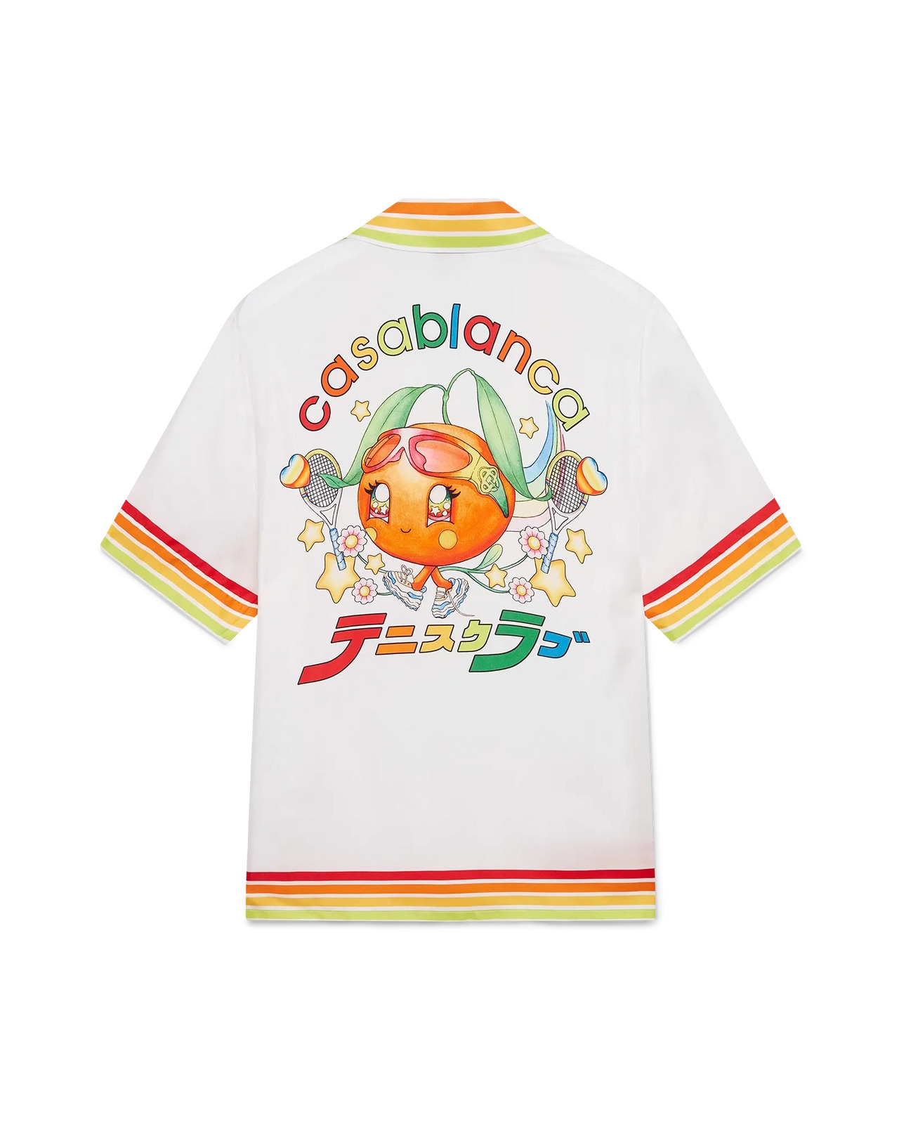 The Kawaii orange mascot silk twill short-sleeve shirt is a printed design featuring seasonal artwork of the Kawaii orange - this character, designed as an orange is a key figure in our universe, featuring Casa accessories, glasses, and sneakers. She is primarily featured in the women's styles in the collection. Completed with a Cuban collar, button closure, interlocking CC logo corozo buttons, a breast pocket, and red, orange, yellow and green stripe edge detail on the collar, cuffs, hem and pocket. - Silk twill fabric - 100% silk - Colour: white - Specialised dry clean only - Made in Italy - Relaxed fit - The model is 187cm/6'1 and is wearing a size M