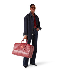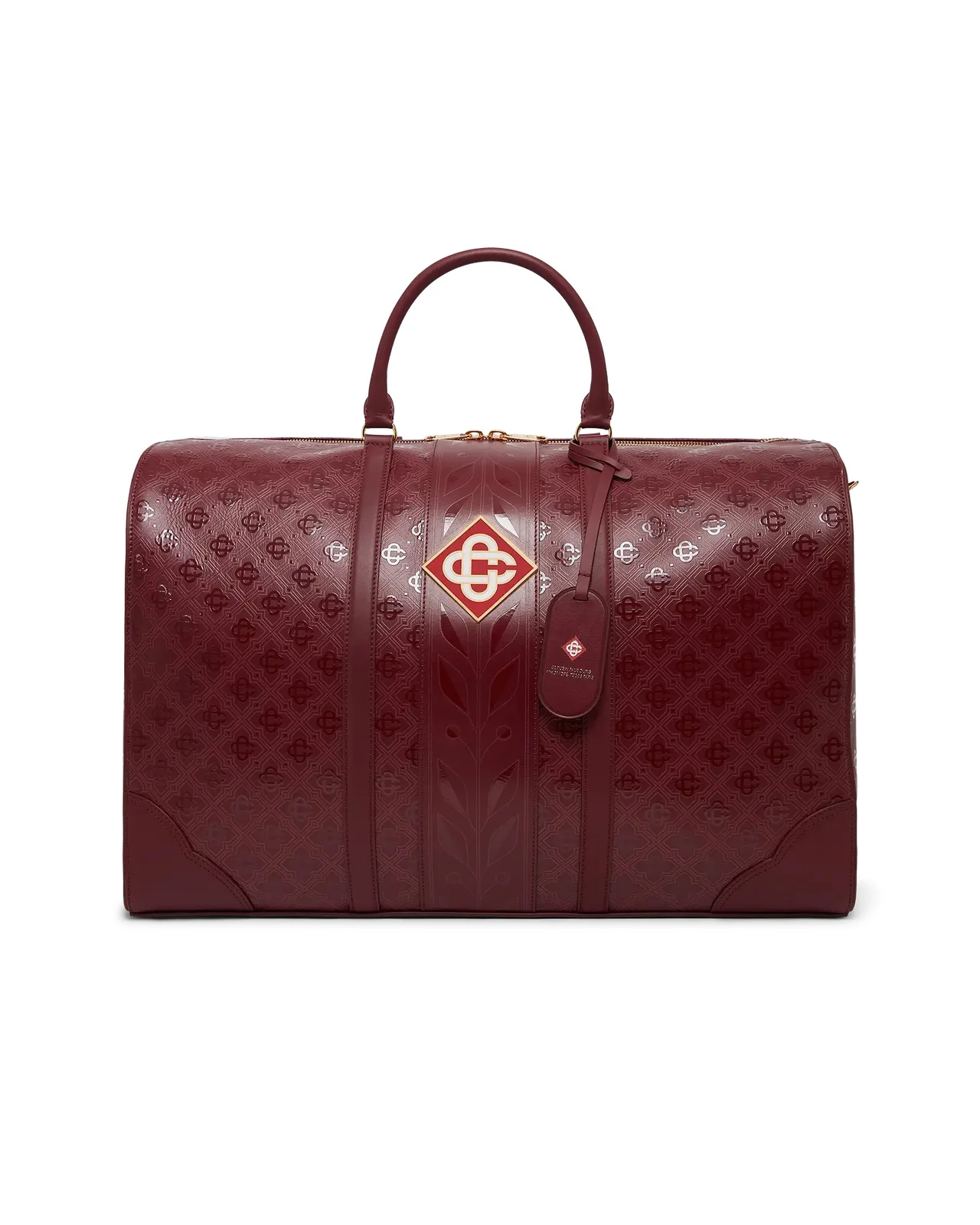 The Paris Store weekender bag is a refined travel design crafted from Italian calf leather, adorned with the house's signature diamond logo on the side. Completed with tonal signature Laurel artwork, grab handles, a zip closure, a shoulder strap, a leather tag, and an internal pocket. Supplied with a gift box, a branded dust bag, and a product detail handbook. - Monogram calf leather - Outer: 100% calf leather - Lining: 100% cotton - Hardware: brass/zamac - Colour: burgundy - Clean with a soft, dry cloth - Made in Italy - Exclusive to casablancaparis.com and our Paris flagship store