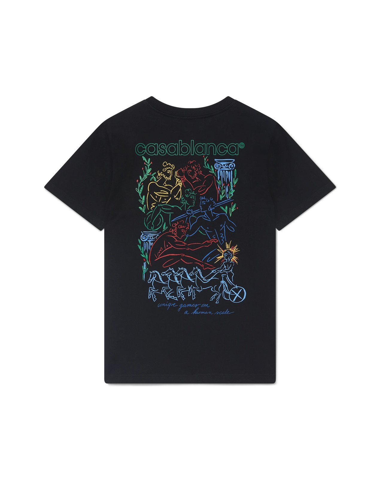 The Pentathlon t-shirt is a short-sleeved screen-printed design crafted from a jersey cotton fabric featuring the house's seasonal artwork inspired by ancient Greece, presenting as a free-hand sketch. Completed with a classic crew neck. 100% organic cotton Colour: black Delicate machine wash Wash and iron inside out, do not tumble dry Made in Portugal Fit true to size, take your regular size The model is 187cm/6’1 and is wearing a size M