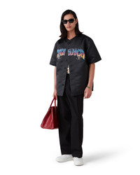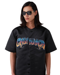 The satin baseball shirt is a short-sleeve knitted design crafted from satin fabric and features the house's signature diamond logo. Completed with button closure, a signature gold rim pearl button at the neck, interlocking CC logo corozo buttons, and hand-drawn typography of the Casablanca logo in the season's gradient, inspired by the gothic typeface used in Chicano tattoos. - Printed satin fabric - Main: 100% polyester - Applique: 90% polyester 10% viscose - Colour: black - Specialised dry clean only - Made in Lithuania - The model is 187cm/6'1 and is wearing a size M