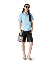 The satin short-sleeve shirt is a classic design crafted from satin fabric. Completed with button closure, branded gold-plated buttons, a point collar, a curved hem, a breast pocket, and beading detail on the collar and breast pocket. - Satin fabric - 100% polyester - Beading: 98% silicone 1% foil aluminium 1% polyurethane - Colour: blue - Specialised dry clean only - Made in Lithuania - The model is 177cm/5'9.5 and is wearing a size S