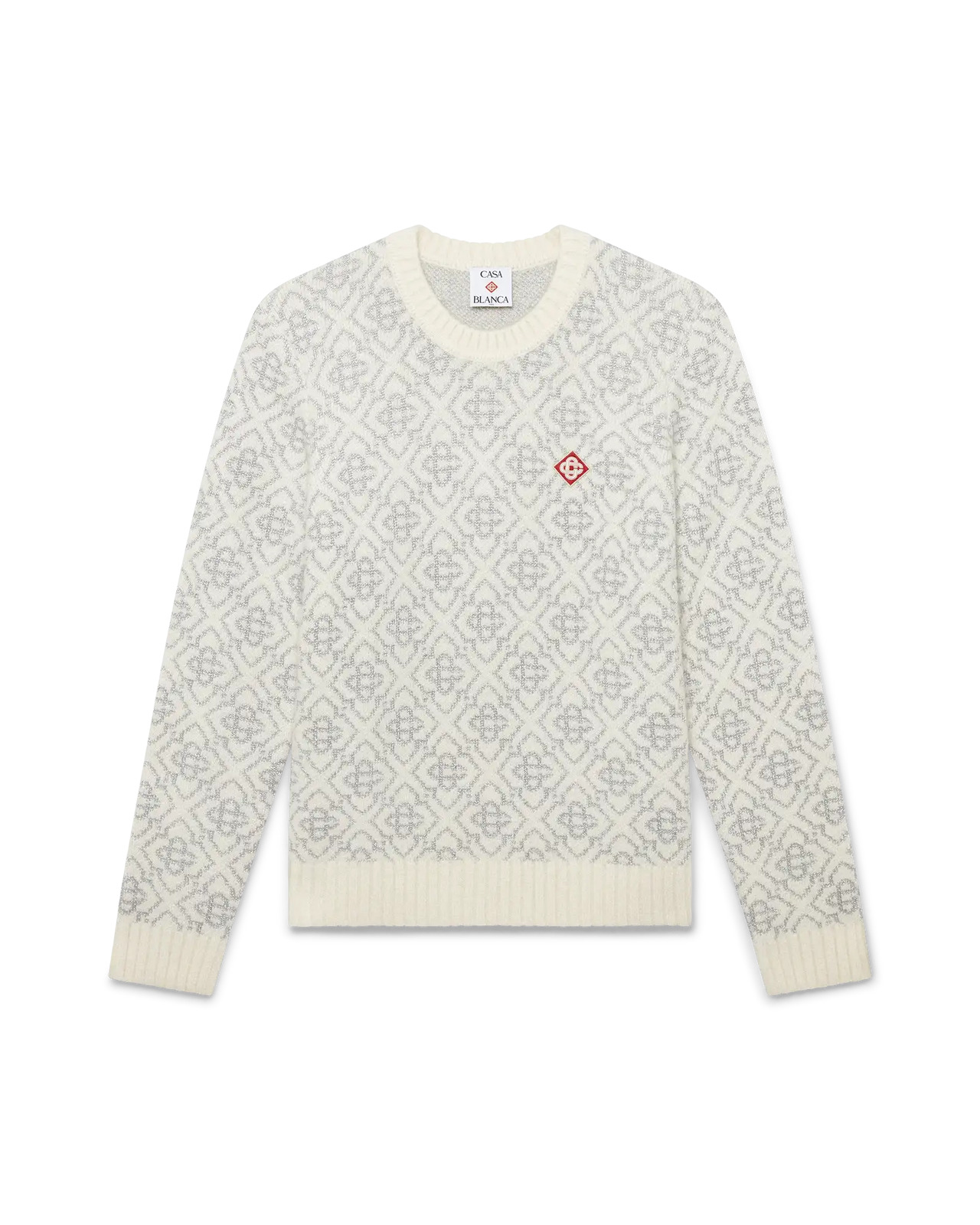 The ski jumper is a refined apres-sport design from mohair fabric featuring the house's white and grey monogram motif, inspired by frost patterns on traditional Japanese farmhouse windows. Drawing from snow crystals on bamboo groves, the design blends sport-leisure elegance with alpine functionality. Completed with a rib knit crew neck and hem. - Mohair mix fabric - Composition: 25% polyamide, 21% viscose, 18% cotton, 14% wool, 13% mohair, 9% polyester - Colour: white/grey monogram - Specialised dry clean only - Made in China - Slim fit - The model is 187cm/6'1 and is wearing a size M - Exclusive to casablancaparis.com, Paris Flagship store and selected retailers