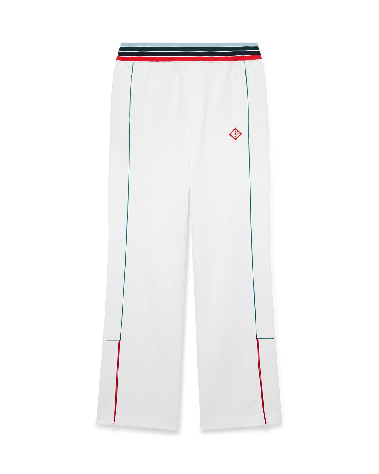 The sports track pants are a straight-leg sportswear design crafted from tricot fabric. Completed with a striped elasticated waistband, piping details down the front, a stripe panel down the sides, in-seam side pockets with zip closure, ankle zips, pin-tuck seams, signature diamond logo, and a welt back pocket with zip closure. - Tricot fabric - Main: 60% polyamide 40% cotton - Lining: 100% polyester - Colour: white - Specialised dry clean only - Made in Portugal - The model is 186cm/6'1 and is wearing a size M