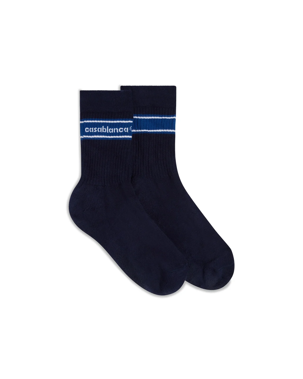 The Sporty Stripe socks are a refined design featuring stripe detailing. This piece embodies the house's apres-sport aesthetic with sophisticated athletic codes. Completed with rib legs, and a contrast Casablanca logo around the cuffs. - Cotton blend fabric - 87% recycled cotton 12% polyamide 1% elastane - Colour: navy - Delicate machine wash - Made in Portugal