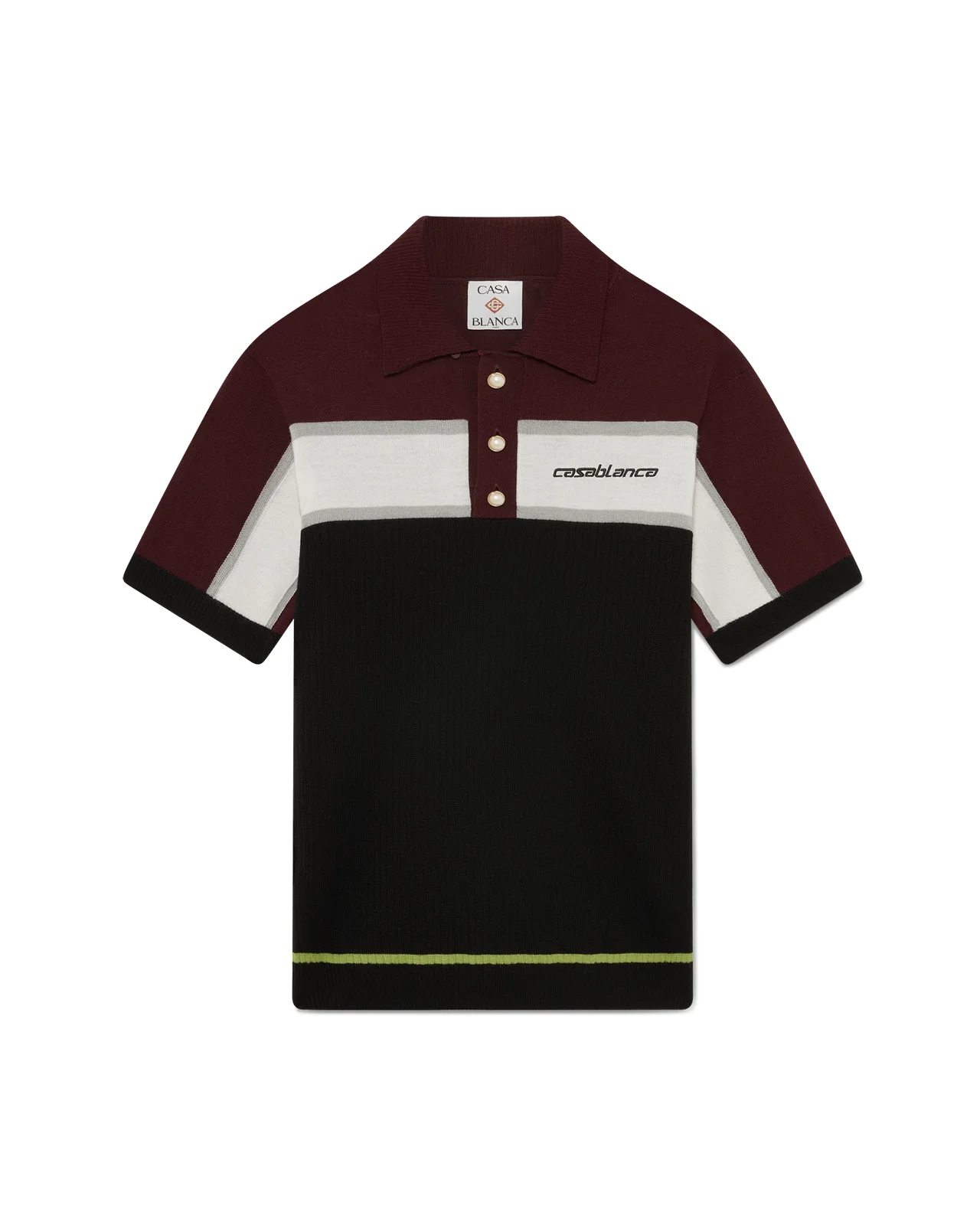 The stripe merino polo shirt is a refined short-sleeve design with a classic knit construction. Completed with a ribbed collar, button placket, signature gold-rim pearl buttons, the silhouette embodies understated elegance with a slim fit. - Wool fabric - 100% merino wool - Colour: black/red/white - Specialised dry clean only - Made in China - Slim fit