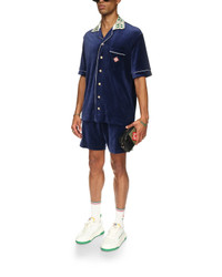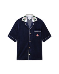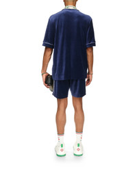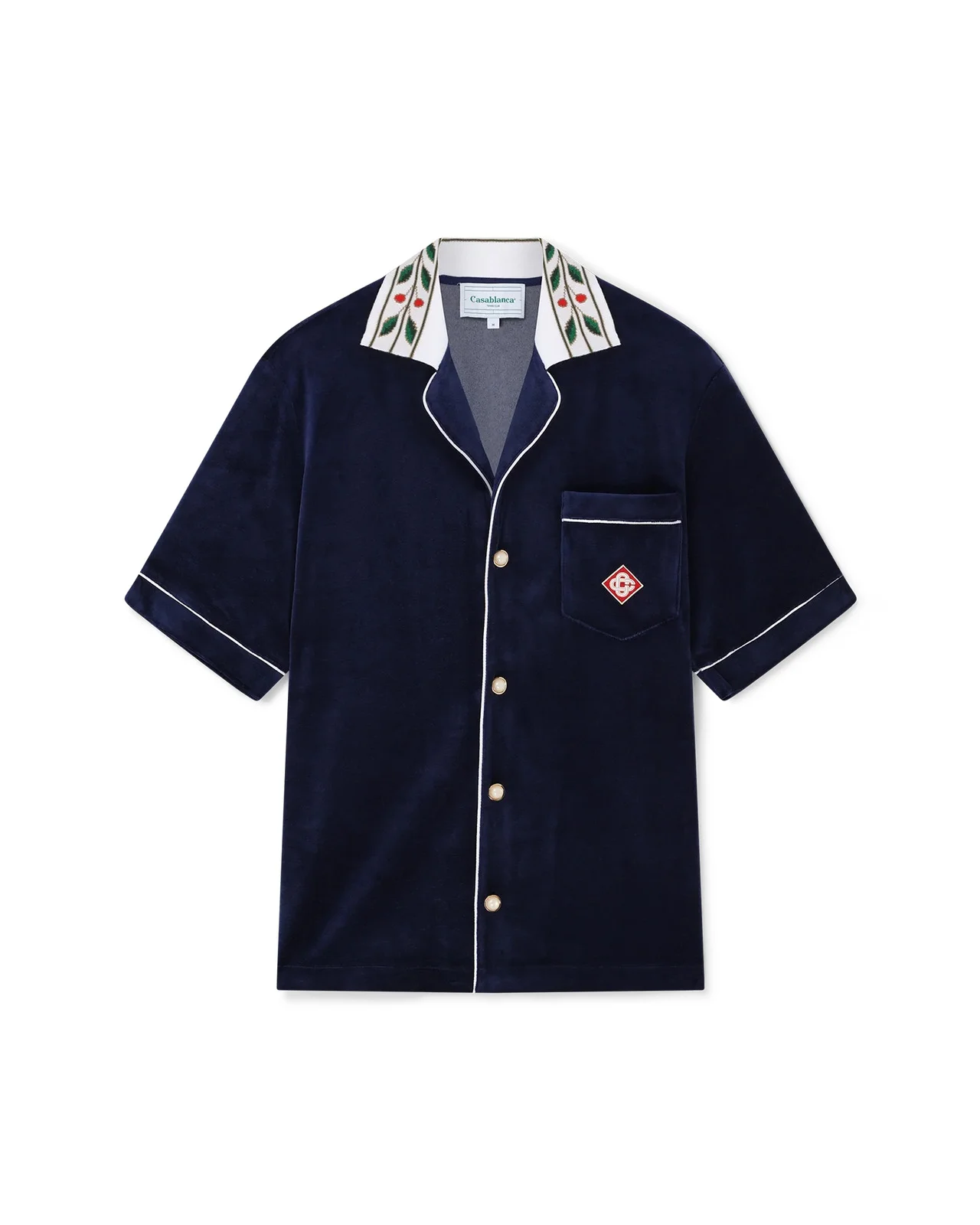 The velour Laurel shirt is a short-sleeve design featuring the Casablanca logo on the breast pocket. Completed with a breast pocket, front button closure, signature gold rim pearl buttons, white piping edge detail on the placket, cuffs and pocket and a knitted collar featuring the house's signature Laurel artwork. - Velour fabric - Main: 40% cotton 40% modal 20% polyester - Collar: 100% cotton - Contrast: 100% polyester - Colour: navy - Specialised dry clean only - Made in Portugal - The model is 187cm/6'1 and is wearing a size M