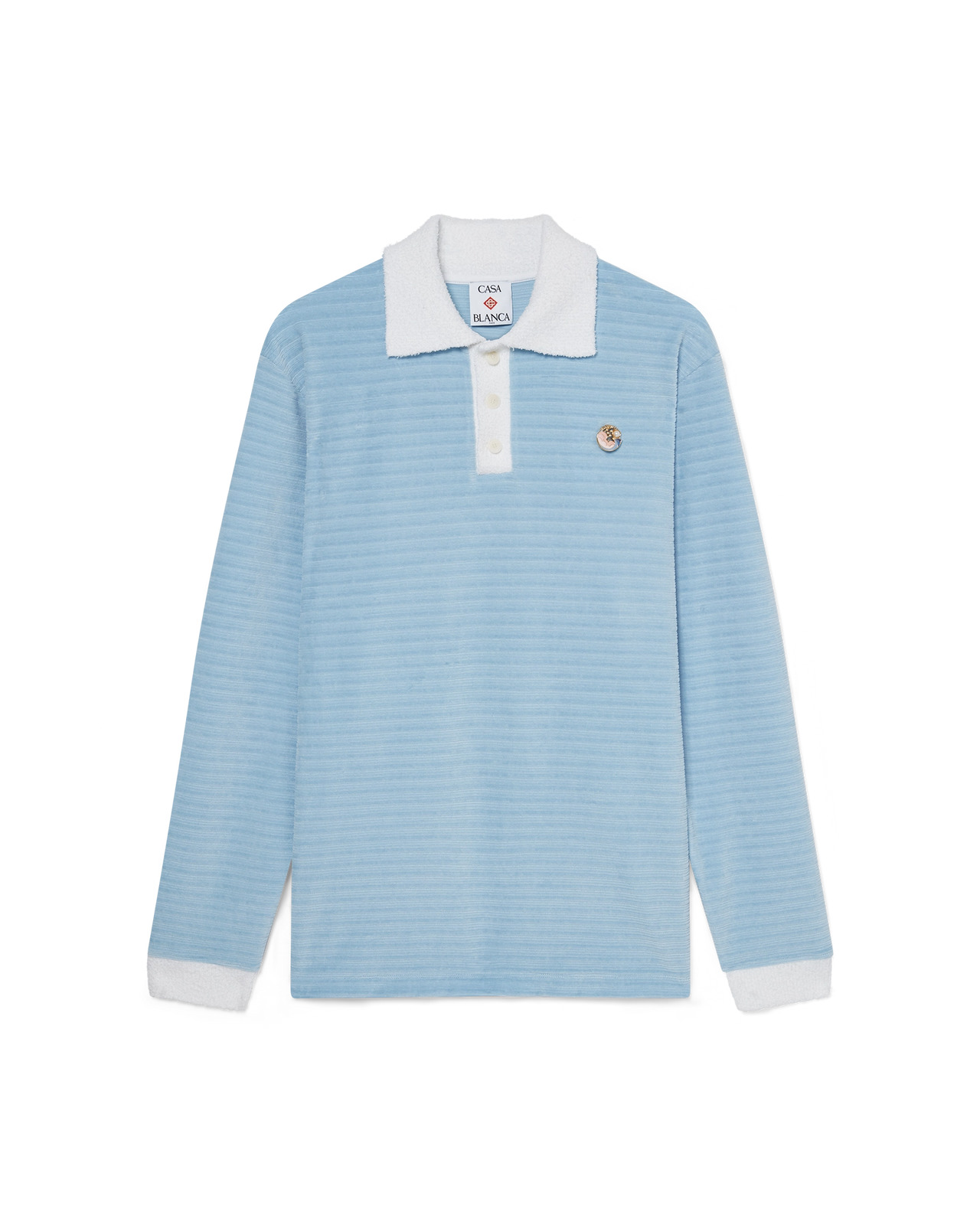 The velour stripe polo shirt is a long-sleeve design crafted from velour stripe fabric featuring the house's four elements pin. Completed with interlocking CC logo corozo buttons, a three-button placket, and a contrast rib placket, cuffs, and collar. - Velour stripe fabric - 73% cotton 16% polyester 10% recycled polyester 1% elastane - Colour: blue - Delicate machine wash - Made in Portugal - The model is 185cm/6'1 and is wearing a size M - Estimated to ship on 19 February 2025