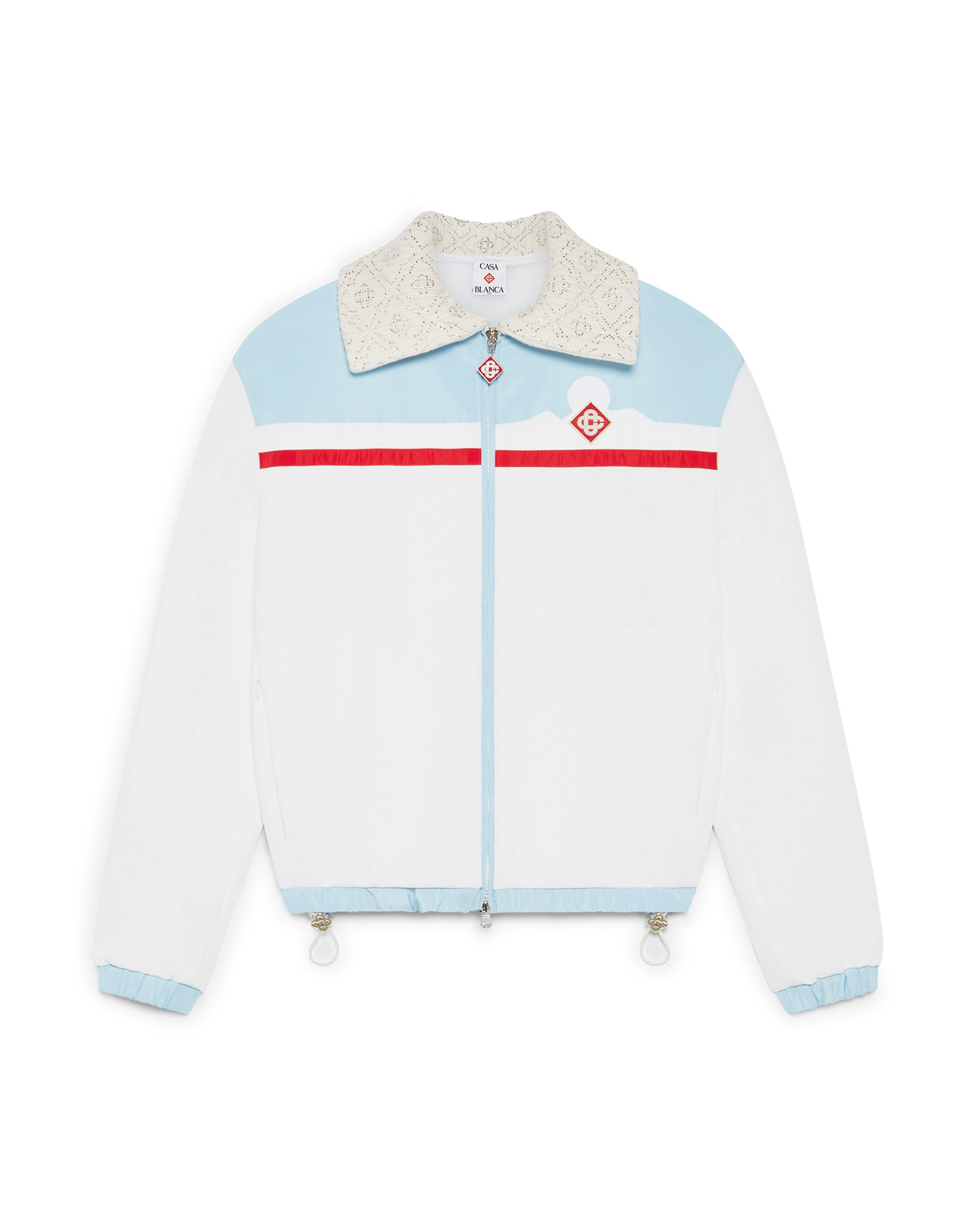 The hybrid ski track jacket is a refined apres-sport design crafted from technical dry fabric in white, inspired by crystalline purity of Japan's alpine countryside. Drawing from morning mist over snow-covered valleys and frozen lakes mirroring towering mountains, the design features performance-oriented construction with polyester lining. - Technical dry viscose fabric - Main: 84% viscose, 12% polyamide, 4% elastane - Lining: 100% polyester - Colour: white/blue - Specialised dry clean only - Made in Portugal - Relaxed fit - The model is 179cm/5'10 and is wearing a size S - Exclusive to casablancaparis.com, Paris Flagship store and selected retailers