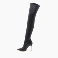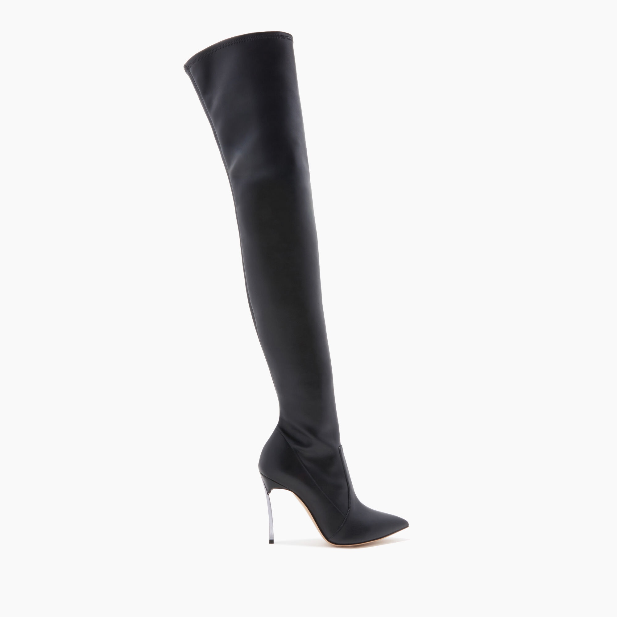 Made in Italy, these over-the-knee boots in black faux nappa leather wrap the leg like a second skin. The eye-catching iconic Blade heel, which recently celebrated its tenth anniversary, and the shape's sharp toe add a sleek, ultra-feminine effect that completes the look. Details - Faux nappa leather made from recycled polyester - 50% Polyurethane and 50% Pet - Stainless Steel Blade Heel. 100 Mm/3.9 Inches - 100% Made In Italy - Code: 1T023V100MC21489000