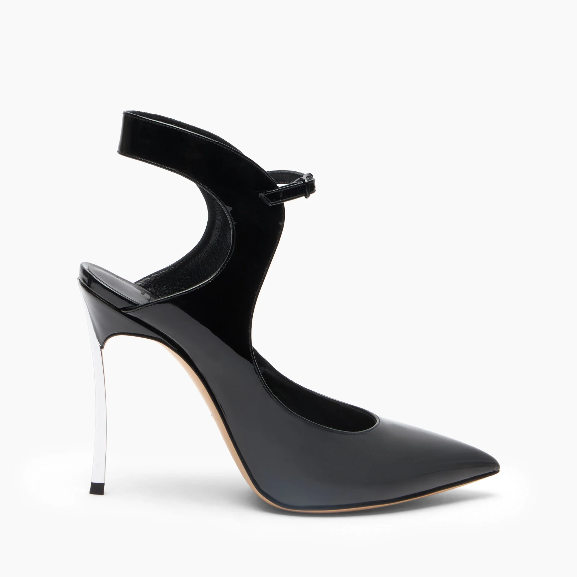 Cesare Casadei reinvents the concept of decollete with this sculptural version in black metallic patent leather with a bold and sensual character. The wraparound design with ankle strap and asymmetrical neckline enhances the silhouette of the foot, while the iconic 12 cm steel Blade heel adds height and an unmistakable signature to the model. A shoe designed for those who love to stand out with elegance and personality, perfect for making even the most essential look unique. Designed for women who want to feel strong and flawless on every occasion—from elegant evenings to the most special moments. A shoe with a bold character, ideal for those who love the perfect balance between power and femininity. Details - Patent leather - 100% Calf - Blade Heel In Real Steel 100 Mm/ 3.9 Inches - 100% Made in Italy - Code: 1H052B100MC13139000