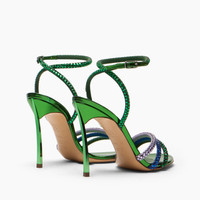 Let yourself be seduced by the Andromeda sandal. Cesare Casadei drew inspiration from the wonders of nature to create a true masterpiece. Featuring the iconic 10 cm Blade heel, this model comes in a mirror-effect fabric with a metallic emerald base and stands out for its fan-shaped rhinestone embellishments in three different colour combinations. A unique and seductive model that will make you shine on the most special occasions. Ideal for summer parties, glamorous events, and evenings when you want to shine with style and personality. Details - Upper in micro rhinestones - 100% Polyester with glass - Blade Heel In Real Steel 100 Mm/ 3.9 Inches - 100% Made in Italy - Code: 1L446B100MC29666706