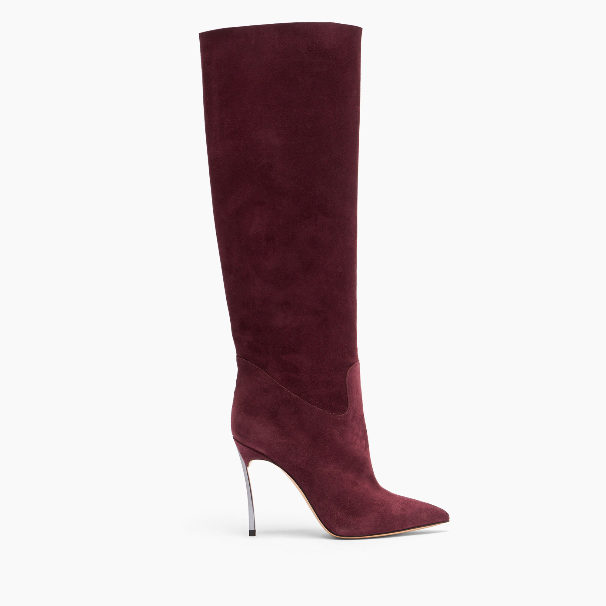 Elegance and boldness meet in this knee-high boot in ruby-colored suede, one of this collection's signature colors. This boot gives a sleek, ultra-feminine effect thanks to the iconic steel Blade heel. Details - Suede - 100% Calf - Blade heel in stainless steel 100 mm / 3.9 inches - 100% Made In Italy - Code: 1S329Y100MC18323702