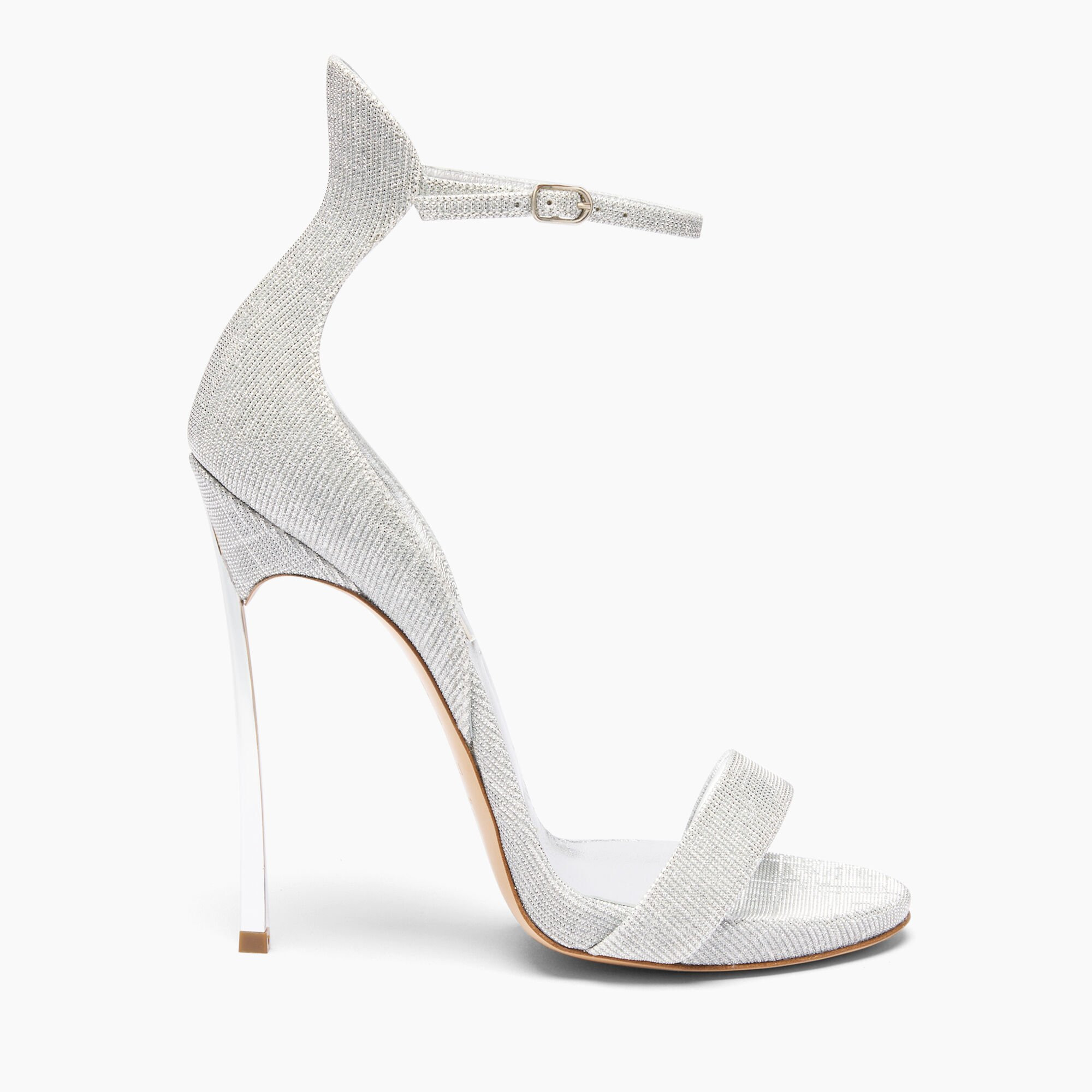 For the Fall/Winter 25-26 collection, Casadei presents the iconic Cappa Blade in silver-colored lurex fabric. The detail of the lasers that reproduce ton sur ton geometric motifs makes this model unique. The iconic 12-cm steel Blade heel slims the figure, and the ankle strap not only adds a touch of elegance, but also ensures stability and a flawless fit with every step. Details - Fine-weave lurex fabric with laser engraving of tone-on-tone geometric motifs - 50% Polyurethane, 42% Polyester and 8% Cotton - Blade heel in stainless steel 125 mm / 4.9 inches - 100% Made In Italy - Code: 1LG50D125MTRINI9701