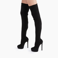 The sensual feel of these above-the-knee boots in soft black stretch faux suede is emphasised by the vertiginous stiletto heel, cushioned by the platform with sinuous lines. This boot enhances the female figure with a glamorous accent. Details - Eco Suede - 100% Polyestere - 140-Mm /5.5-Inch Faux-Suede Covered Heel 30-Mm/1.118-Inch Concealed Platform - 100% Made In Italy - Code: 1T028W1401ARCEU9000